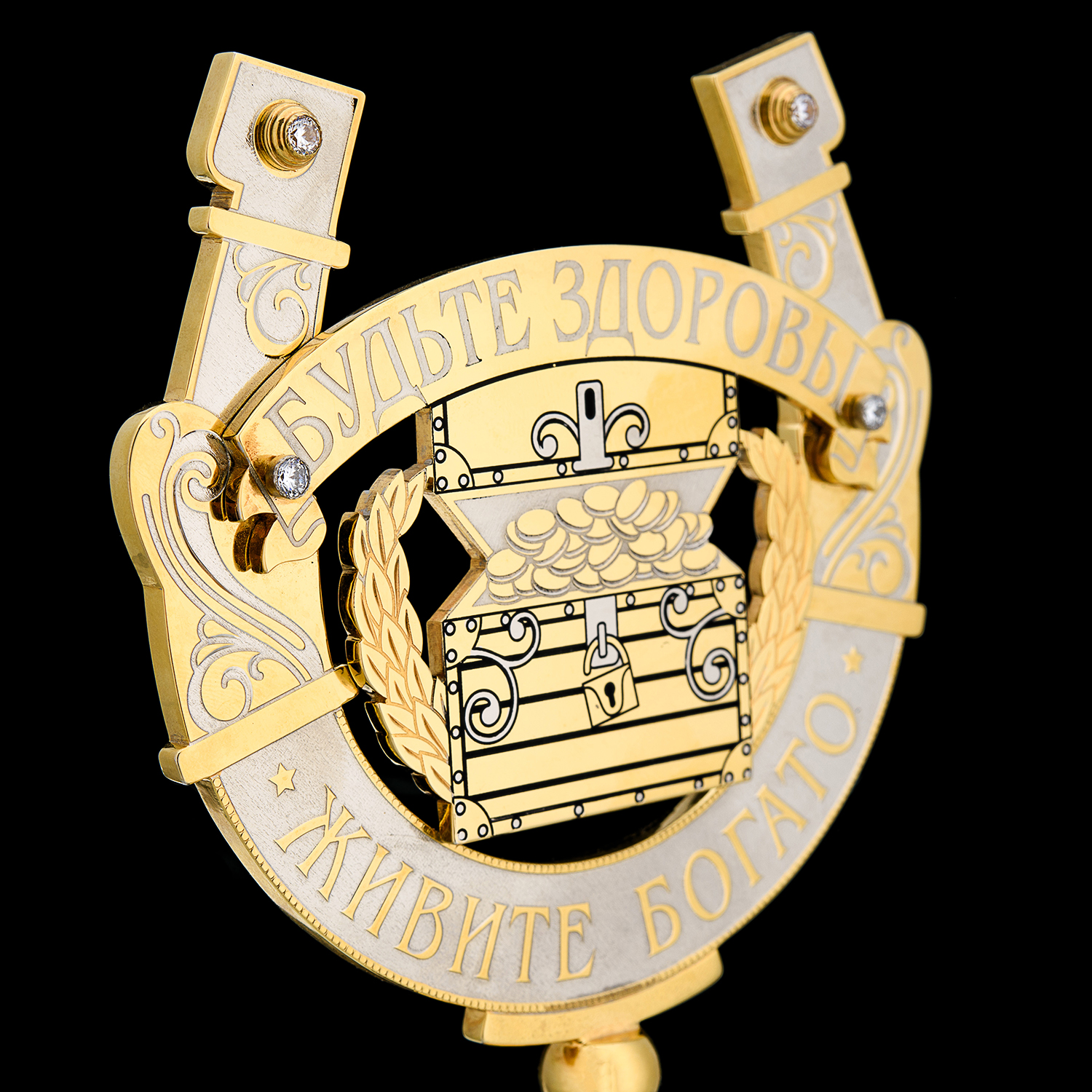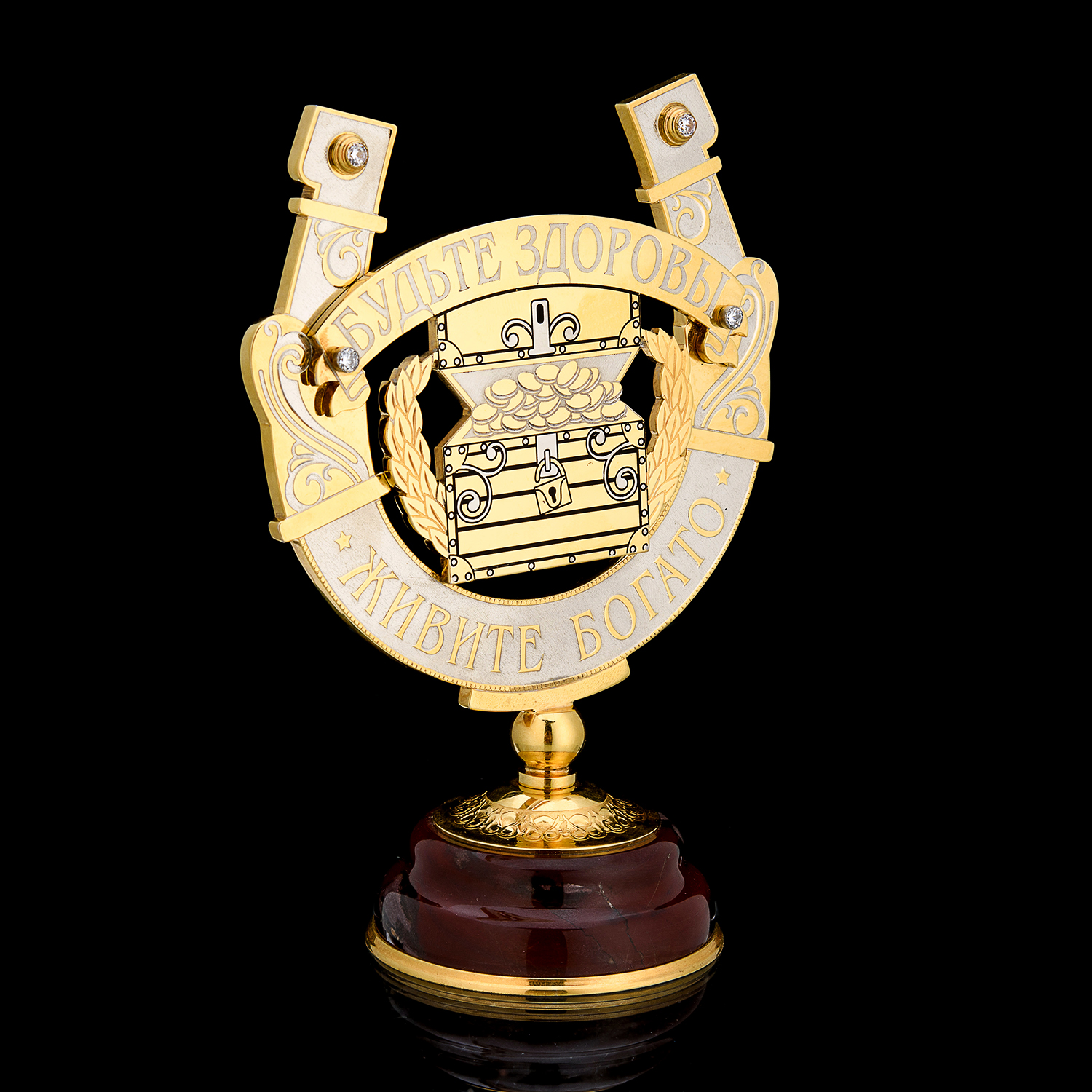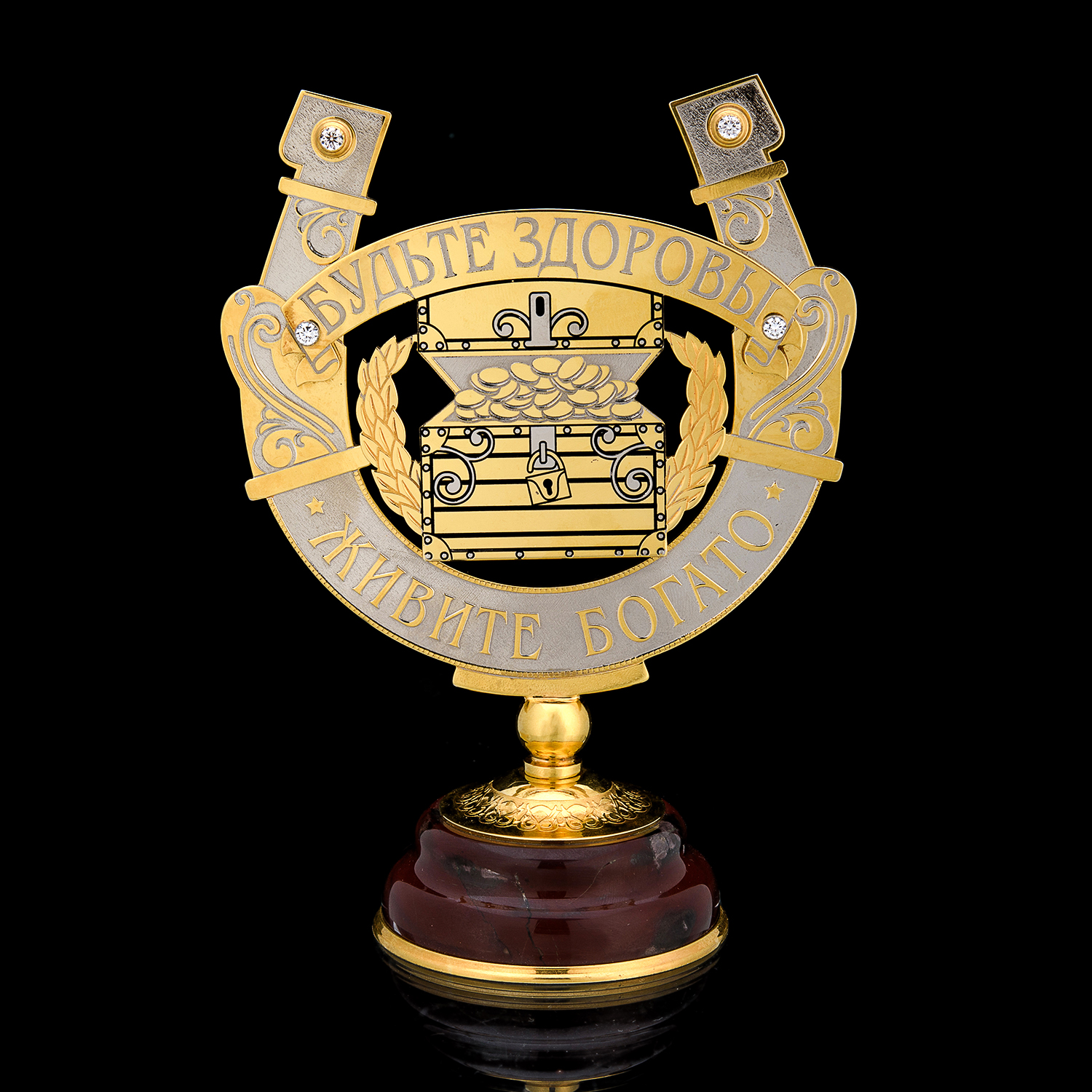 Русские подарки и сувениры → Интерьерные изделия → Статуэтки → Сувенирная подкова "Будьте здоровы - живите богато". Златоуст