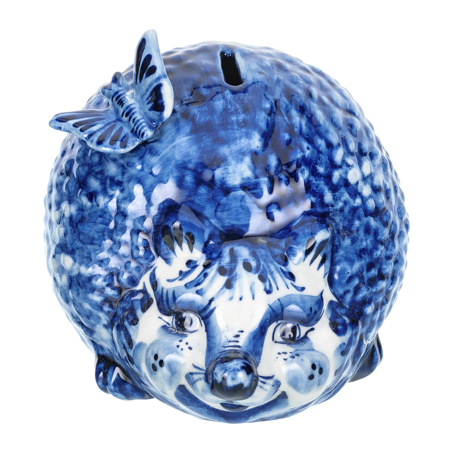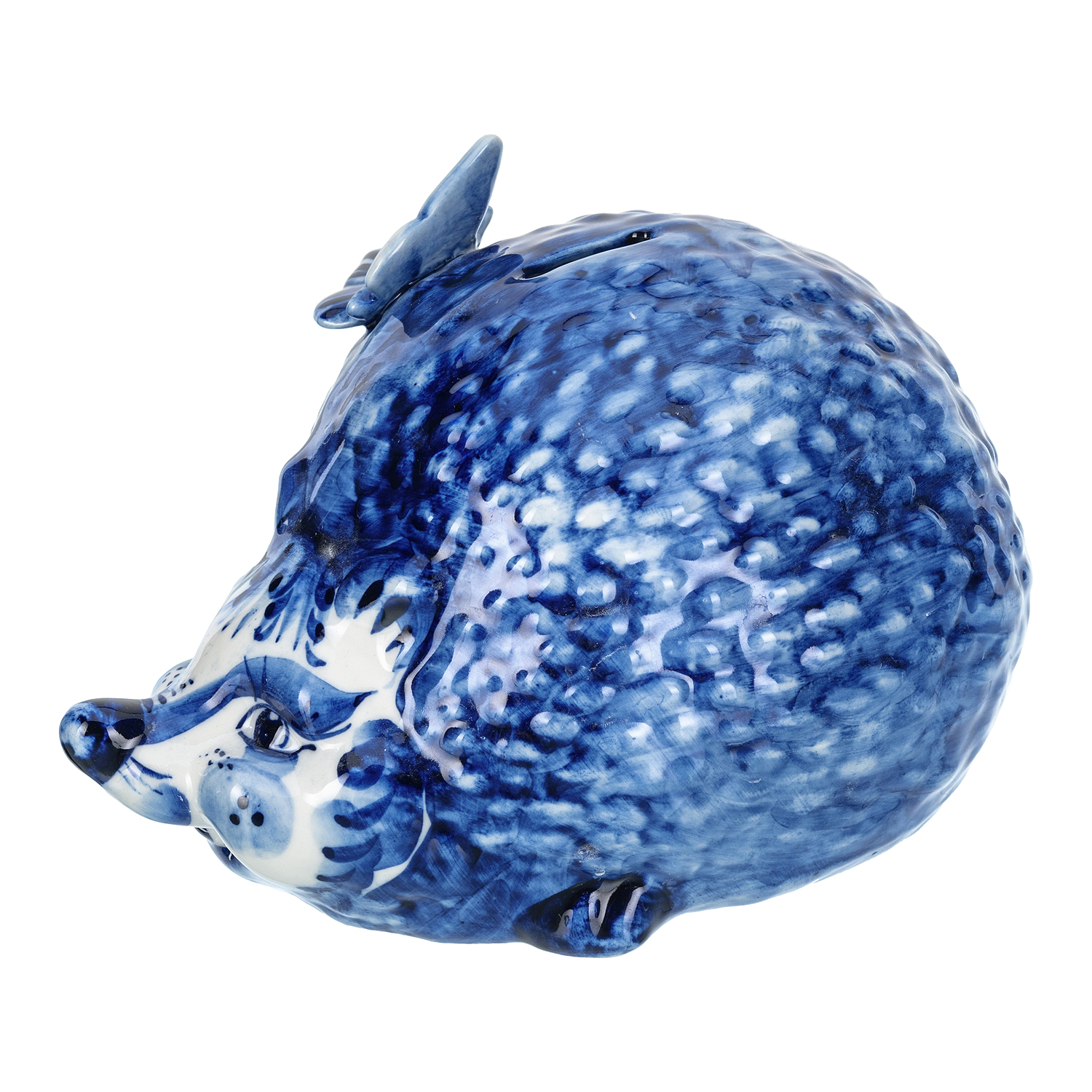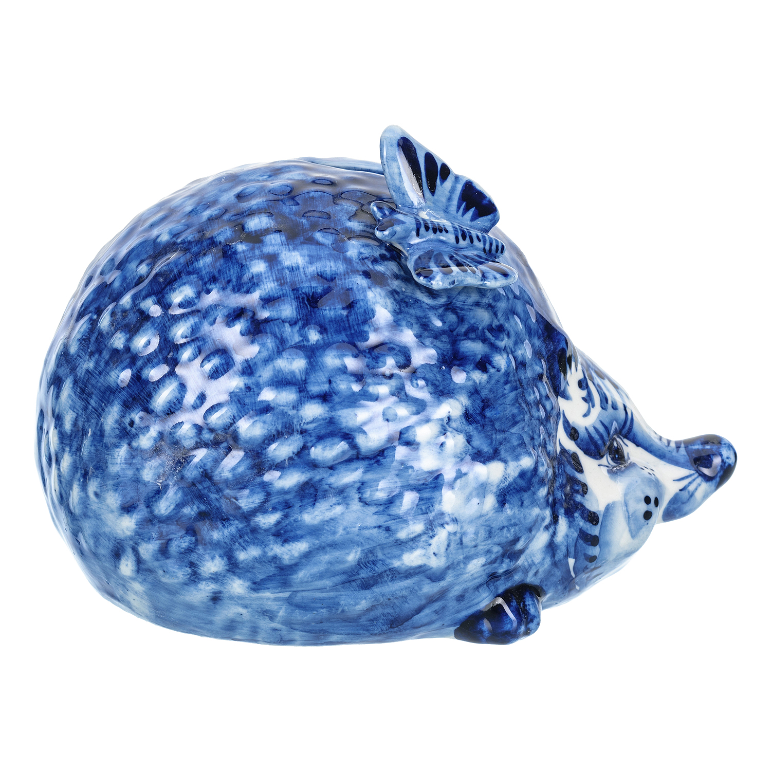 Русские подарки и сувениры → Интерьерные изделия → Статуэтки → Статуэтка-копилка "Еж с бабочкой". Гжель
