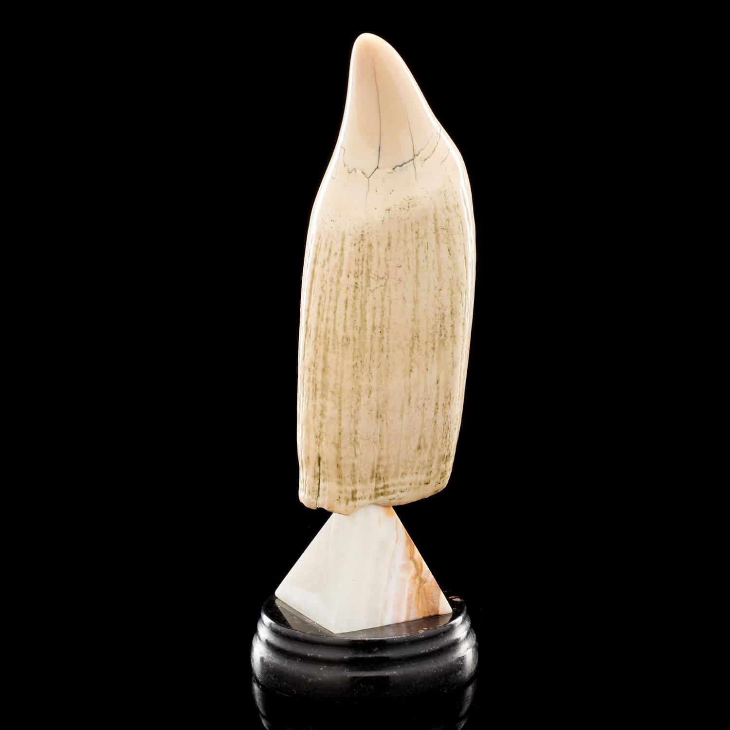 Массив клыка позволил продемонстрировать северорусский стиль  росписи по кости. Зуб кашалота - чудодейственный амулет и талисман. С древних времен зуб единственного современного представителя семейства кашалотовых ценится художниками-резчиками за красоту и сакральные свойства.