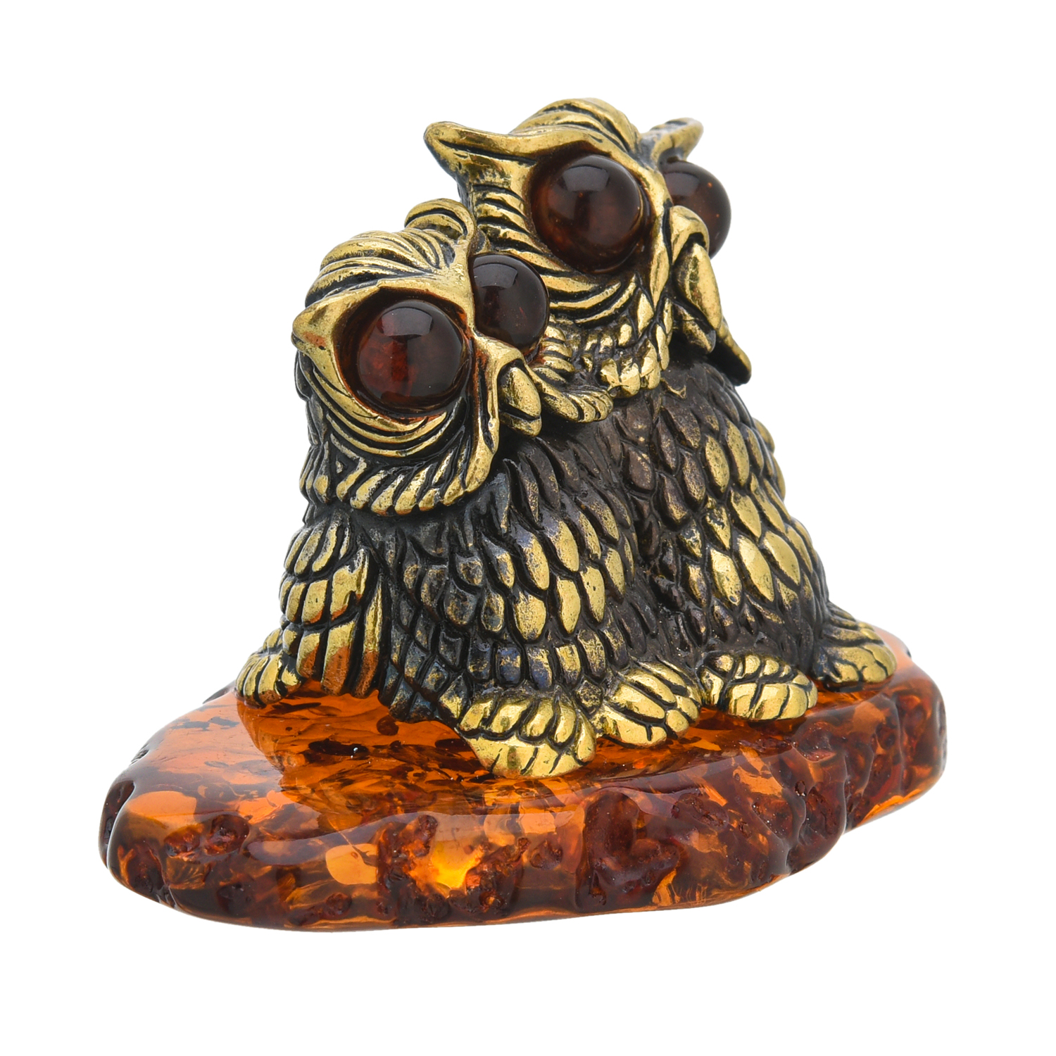 Статуэтка с янтарем "Совушки вместе навсегда".Материалы: латунь, янтарь.
