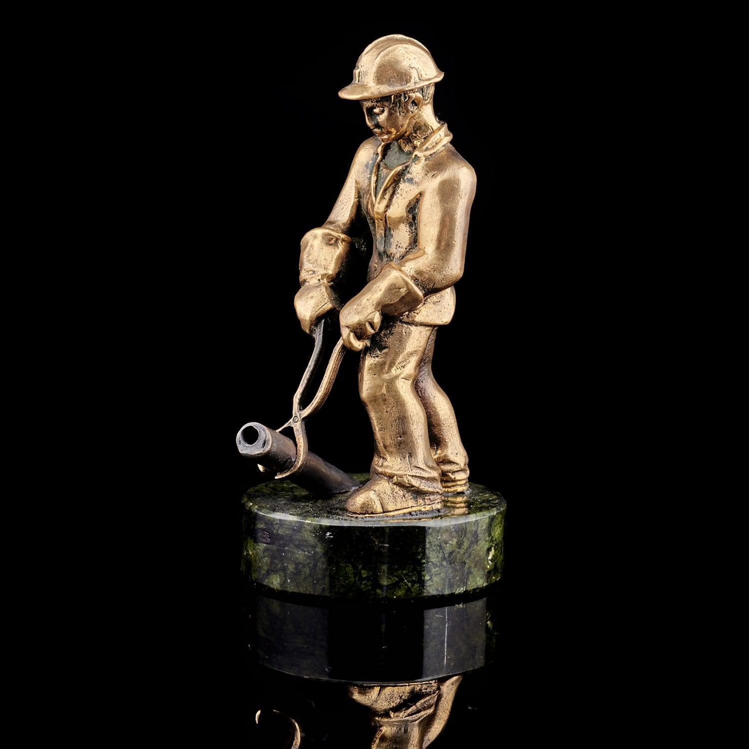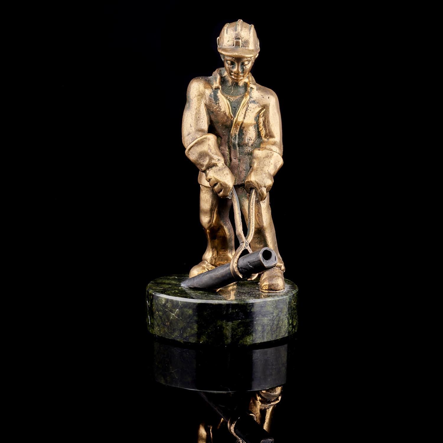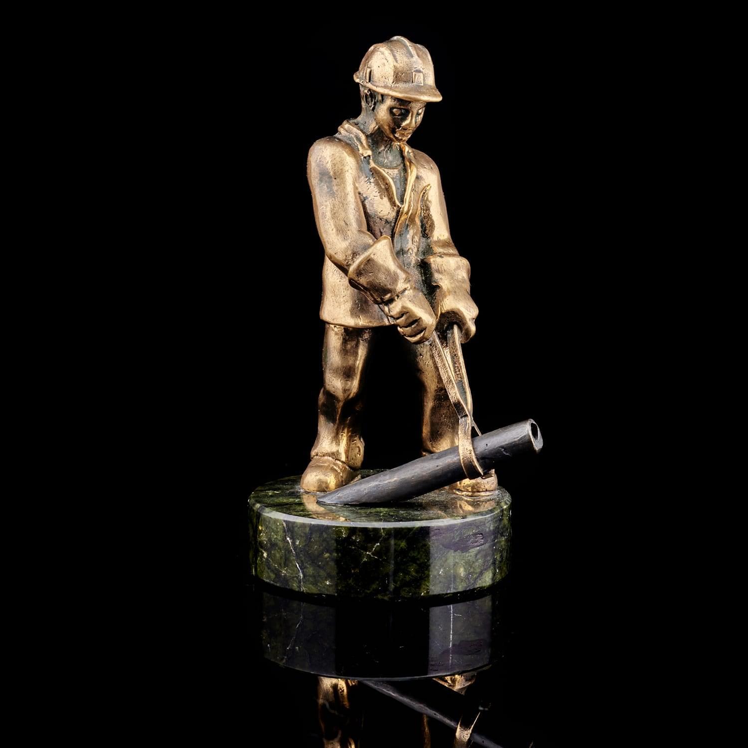 Динамичный образ рабочего трубопрокатного завода в профессиональной экипировке, делающего трубу из сплава цветных металлов, представлен мастером бронзового литья на каменном постаменте из камня змеевик. Авторская статуэтка призвана создать в интерьере символичный акцент и стать выражением харизмы представителя востребованной мужской профессии. Скульптура отлита в соответствии с авторским эскизом, оформлена позолотой и патиной...