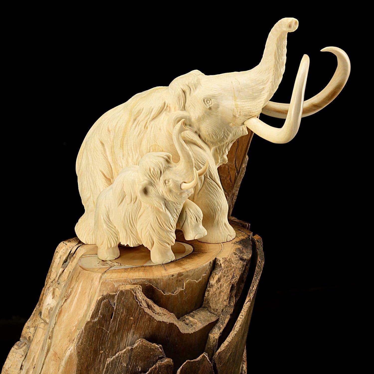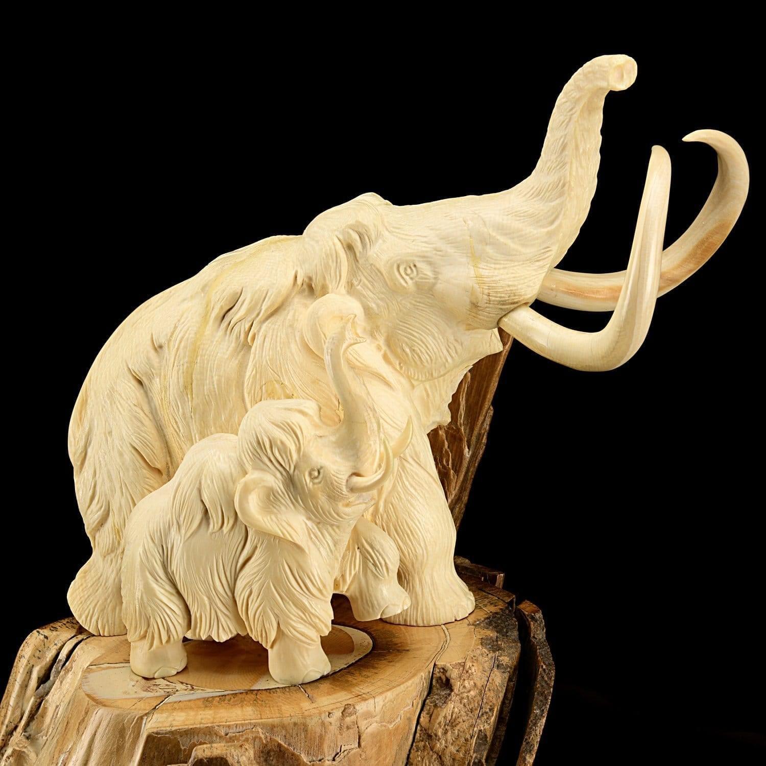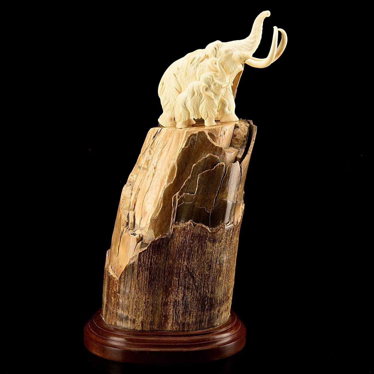 Русские подарки и сувениры → Интерьерные изделия → Статуэтки → Композиция из бивня мамонта "Мамонты" на скале