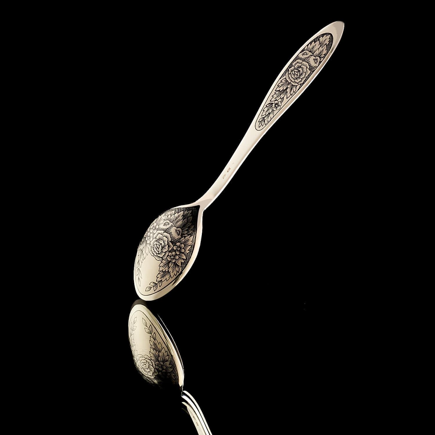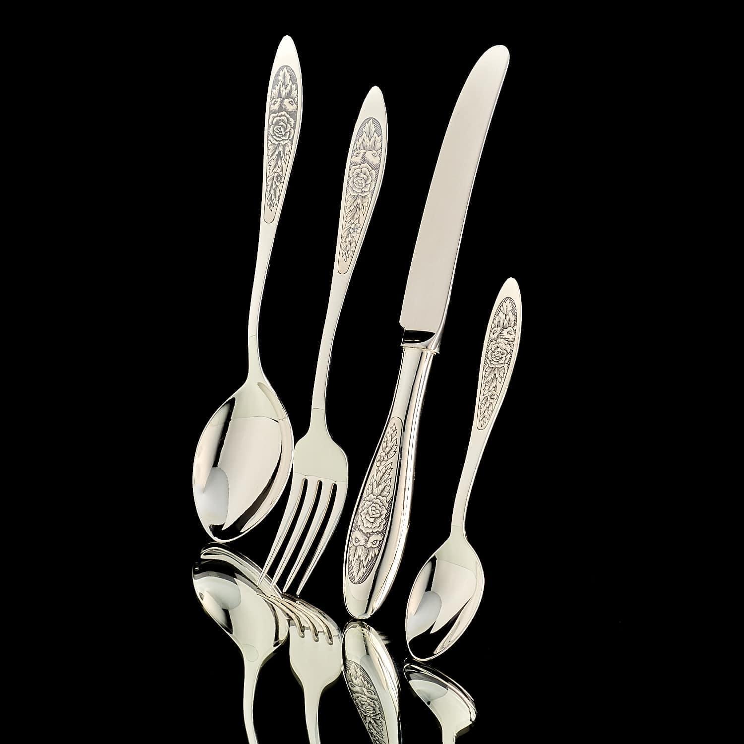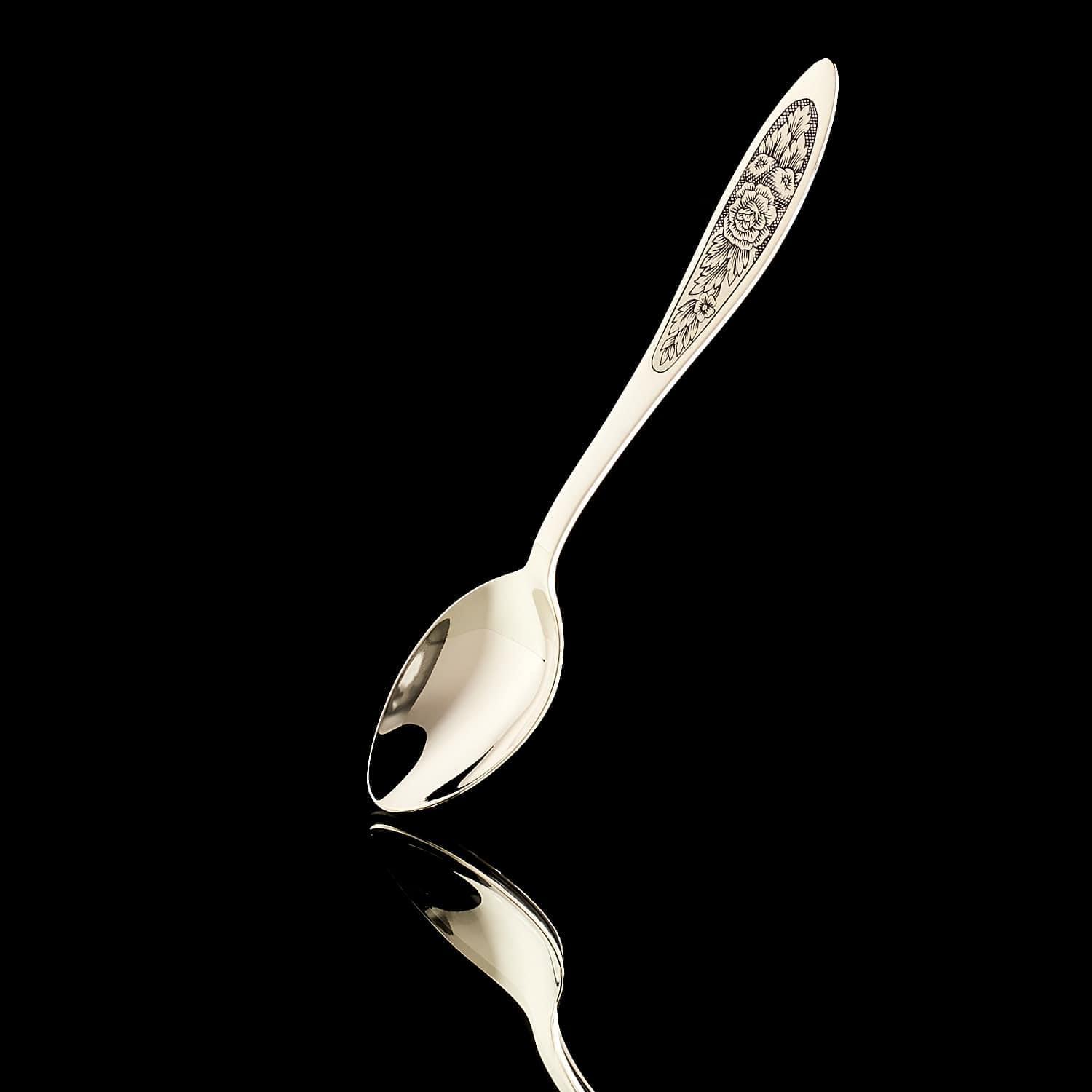 Серебро настолько тягучий, пластичный и ковкий металл, что легко режется ножом. Его использовали еще до нашей эры. В Сардинии серебро добывали и обрабатывали с эпохи раннего энеолита. В древности вавилоняне и ассирийцы считали его символом Луны и почитали как священный металл. В России он впервые был выплавлен в конце 17 века. Само слово переводится как «светлый»/«белый», восходит к древнеиндийскому «сарпа» - название Луны и древнего орудия земледельцев. Итальянский мореплаватель Себастьян Кабот встретил моряка, утверждавшего, что видел страну с горами серебра. Путешественник отправился искать его в Аргентину, но не нашел. Благодаря этой истории государство получило свое название. Самые большие запасы серебра находятся в Индии и в нейронах человеческого мозга. Согласно легендам, металл отпугивает вампиров, злых духов. На Руси в качестве первой валюты употребляли серебряные брусочки, которые рубили на части (отсюда и название «рубли»). Размеры: столовая ложка - 20,5 см. чайная ложка - 14,5 см. вилка - 20 см. нож - 22,5 см. ....Извините, товар отсутствует