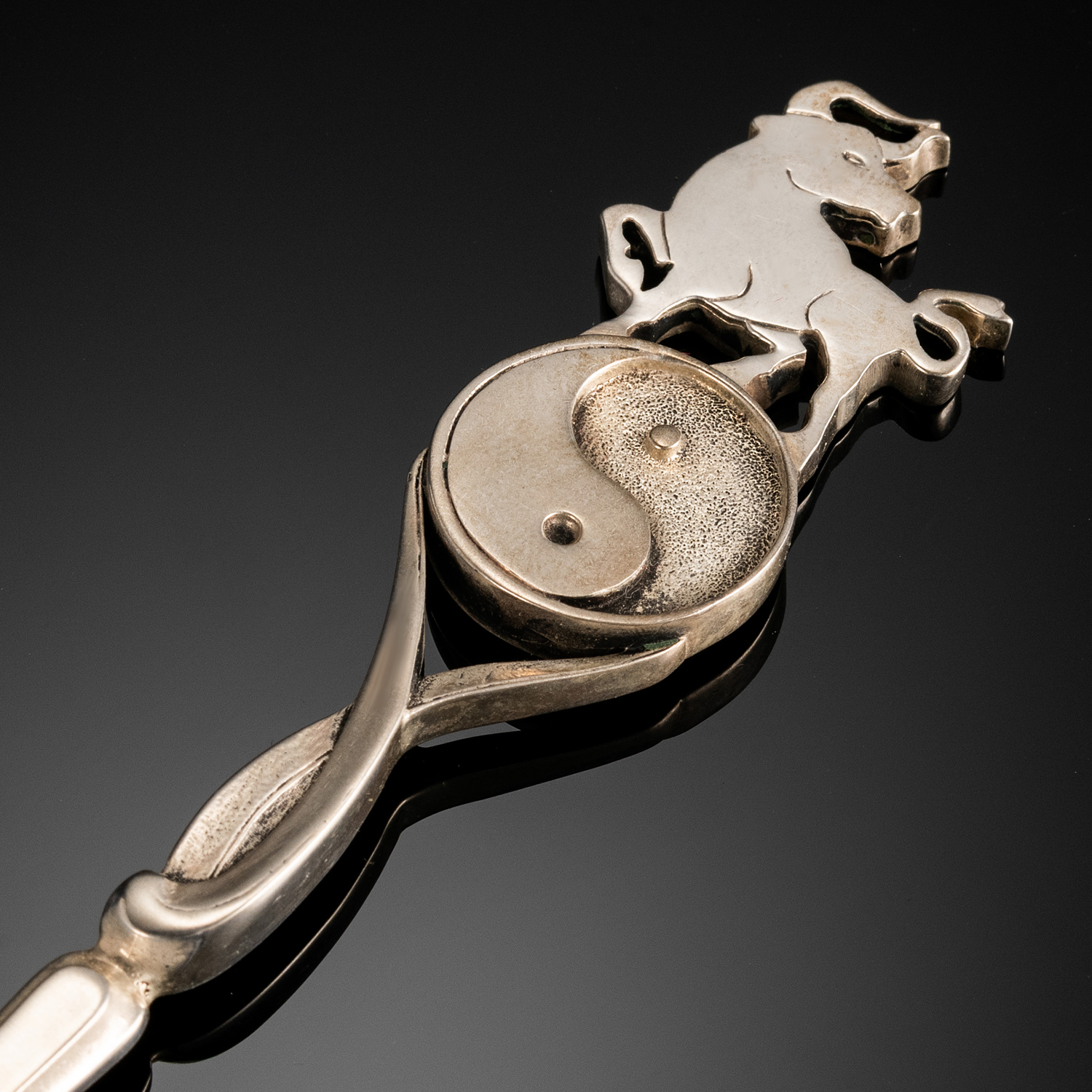 Верхушка держала серебряной ложки украшена изображением символа инь-янь с образом хищной кошки. Дизайнерская серебряная ложка - традиционный подарок на счастье. На Руси ложка была символом достатка и благополучия. Благодаря ионам серебра она изменяет структуру воды, делая любой напиток более полезным. Серебро в древности почиталось выше золота. Его защитные, целебные свойства были известны царским особам, окружавшим себя вещами из серебра. Столовое серебро стало популярным в Российской Империи благодаря царю Петру I. Именно он привез в Россию первый серебряный сервиз. При дворе императрицы Екатерины II серебряная посуда пользовалась огромной популярностью. Любили серебро не только за его красоту, но и за антисептические свойства.