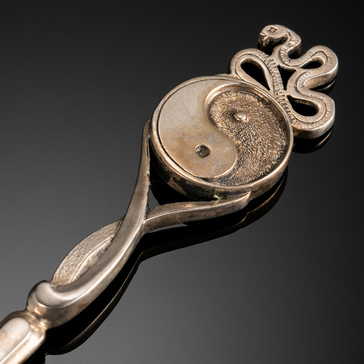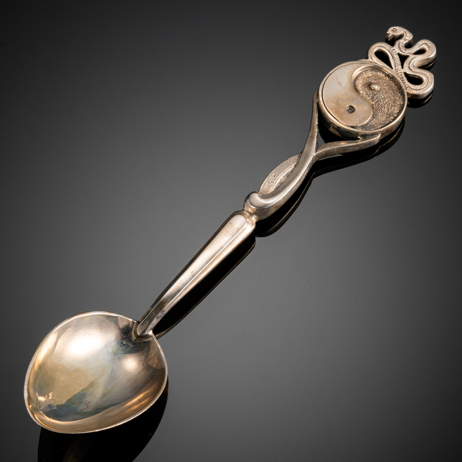 Верхушка "держала" предлагаемой серебряной ложки украшена изображением символа "инь-янь" с образом хищной кошки. Этот столовый прибор изготовлен в соответствии с авторской формой методом литья из драгоценного металла-самородка, серебра.Дизайнерская серебряная ложка - традиционный подарок на счастье.