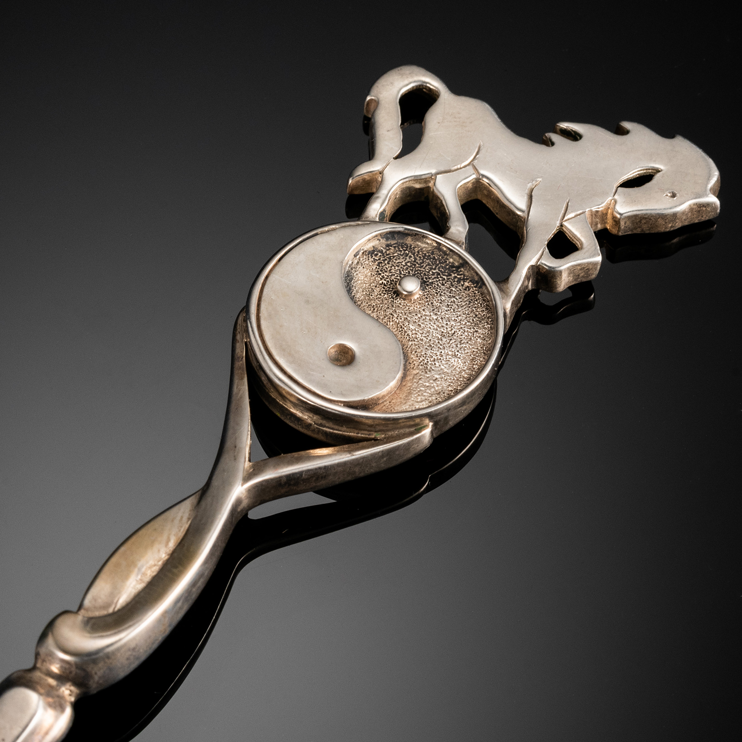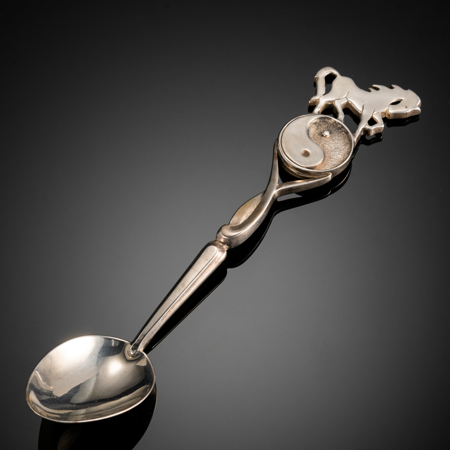 Верхушка "держала" предлагаемой серебряной ложки украшена изображением символа "инь-янь" с образом хищной кошки. Этот столовый прибор изготовлен в соответствии с авторской формой методом литья из драгоценного металла-самородка, серебра.Дизайнерская серебряная ложка - традиционный подарок на счастье.