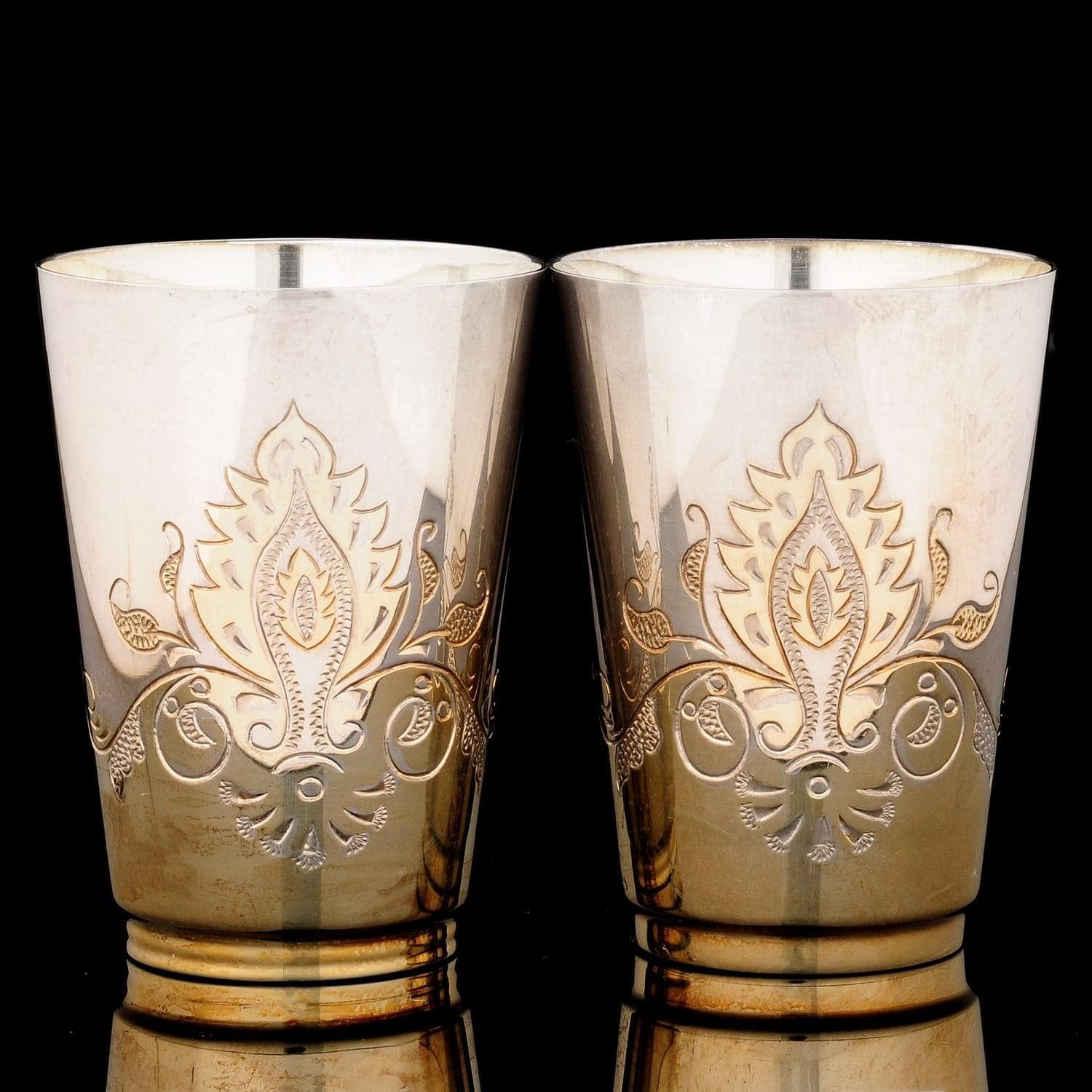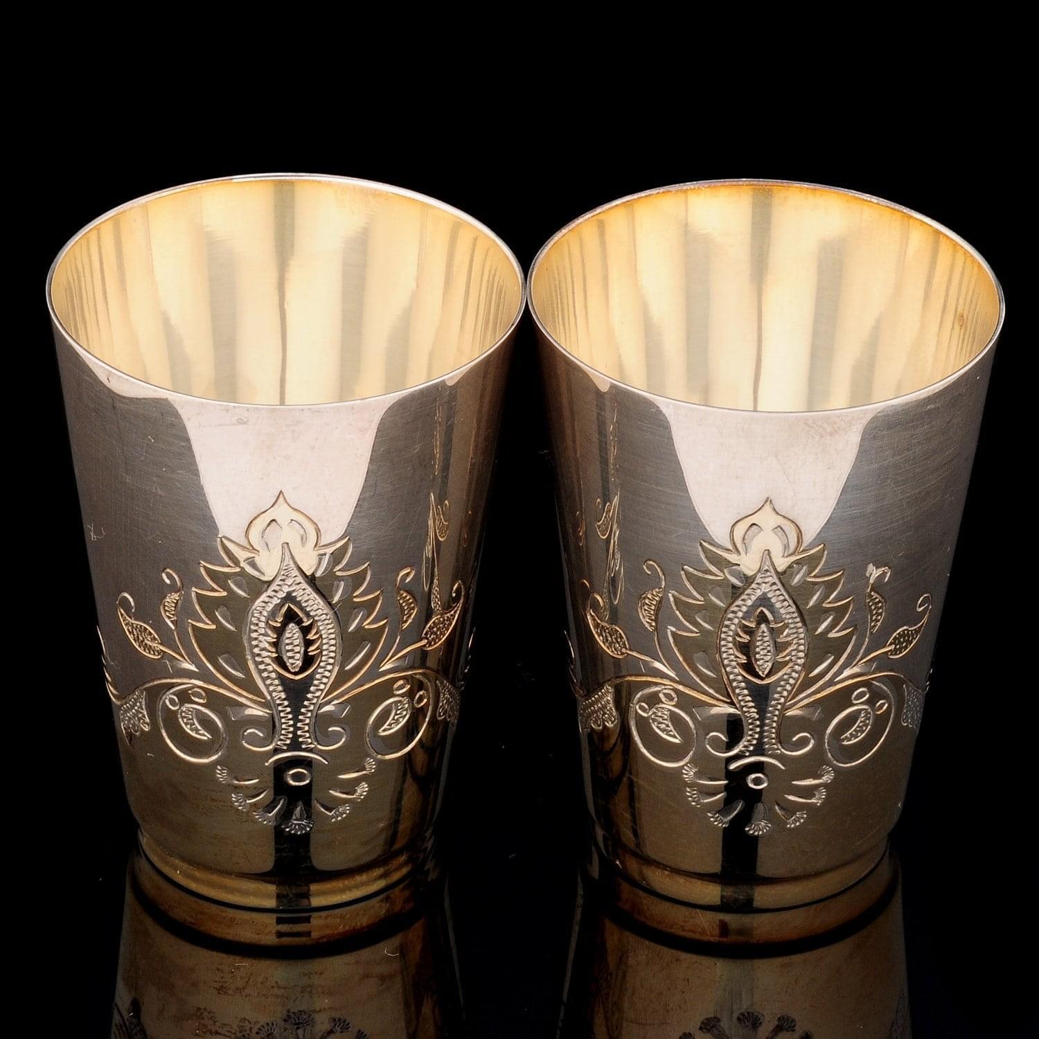 Серебряные стопки украсят стол во время трапезы, придав обстановке торжественность. Эксклюзивные изделия  из серебра украшены позолоченным растительным орнаментом. Оригинальность исполнения и функциональность являются главными достоинствами данного изделия.