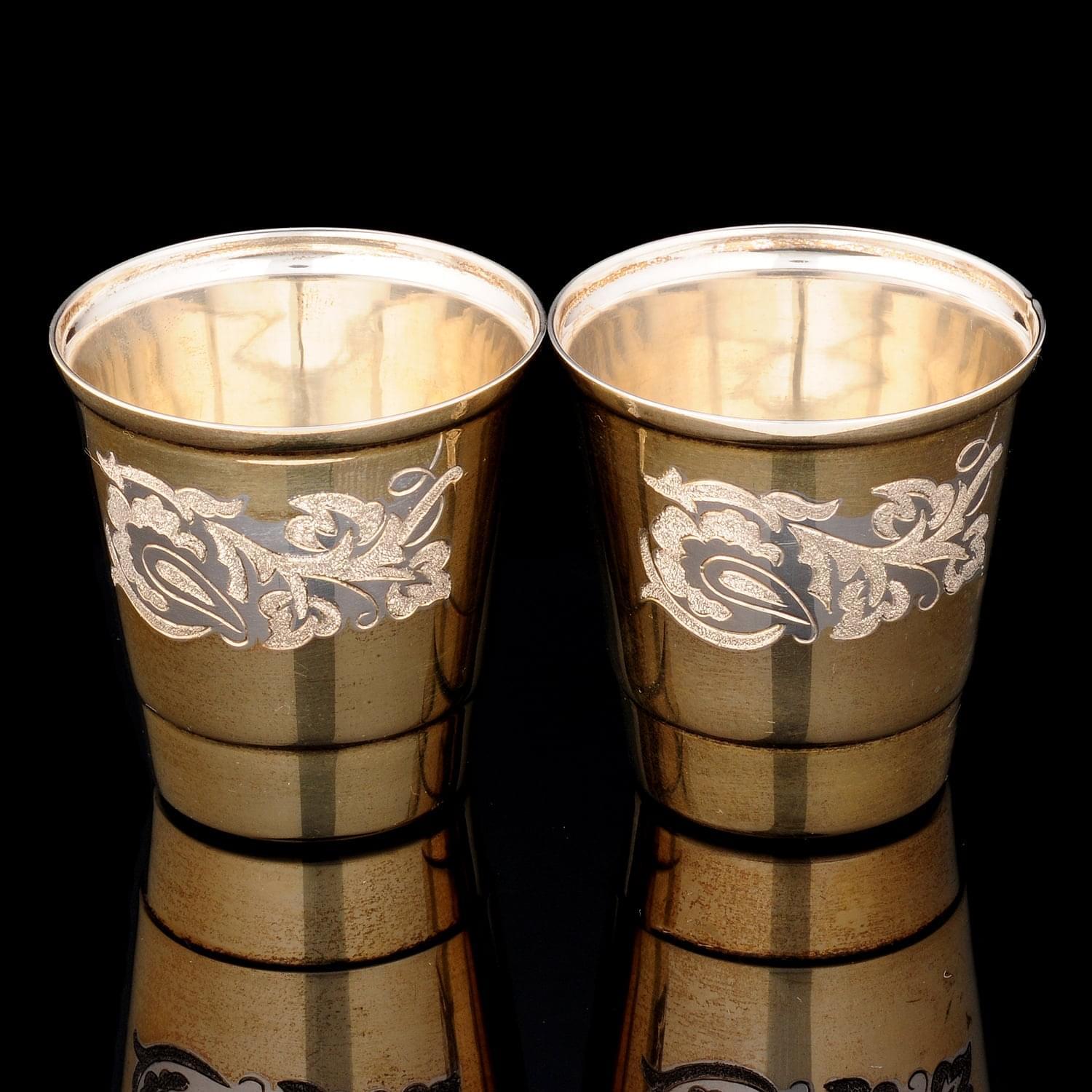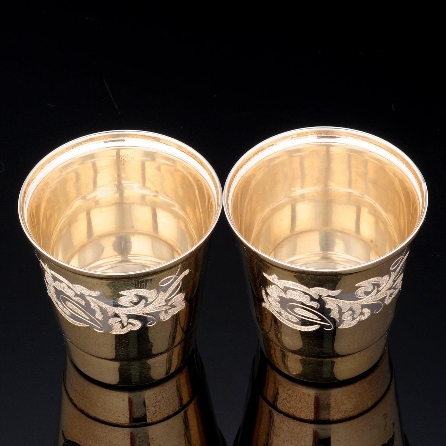 Корпус каждой стопки оформлен в соответствии с оригинальным авторским эскизом художником по металлу из драгоценного металла-самородка, серебра. Стопки красиво смотрятся в подарочной упаковке! На корпусе каждой выгравирован растительный орнамент в барочном стиле.