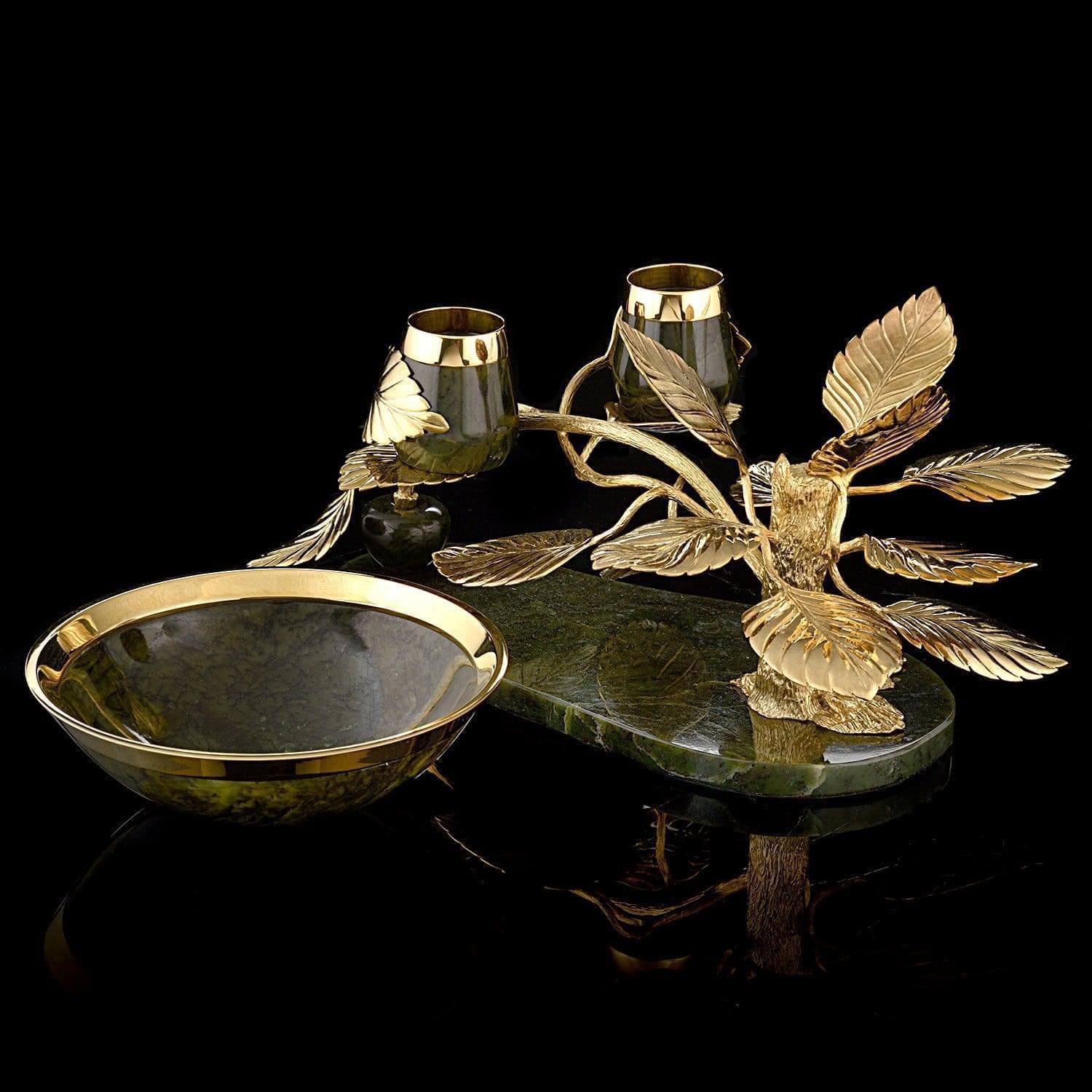 Набор включает два питейных сосуда с корпусами из нефрита, украшенными декоративными элементами из латуни с выгравированными на них вручную композициями и орнаментами, затем - чашу из нефрита с декоративным элементом из латуни, подставку с яблоней.