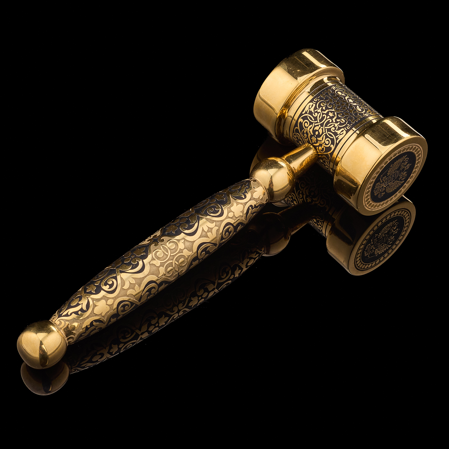Молоток судейский с позолотой и гербом. Златоуст.Материалы: латунь, никель, золото 999,9*, эмаль, дерево.