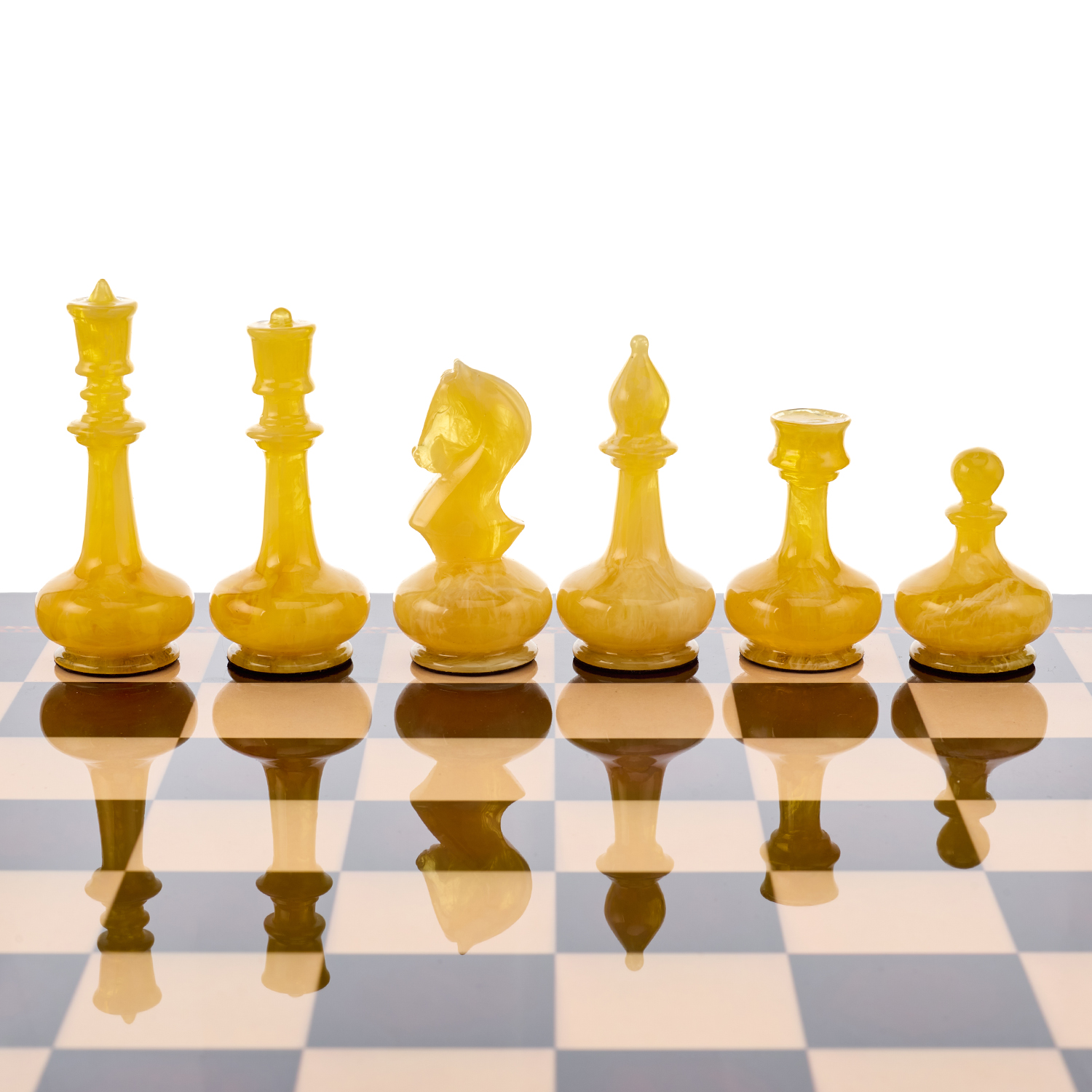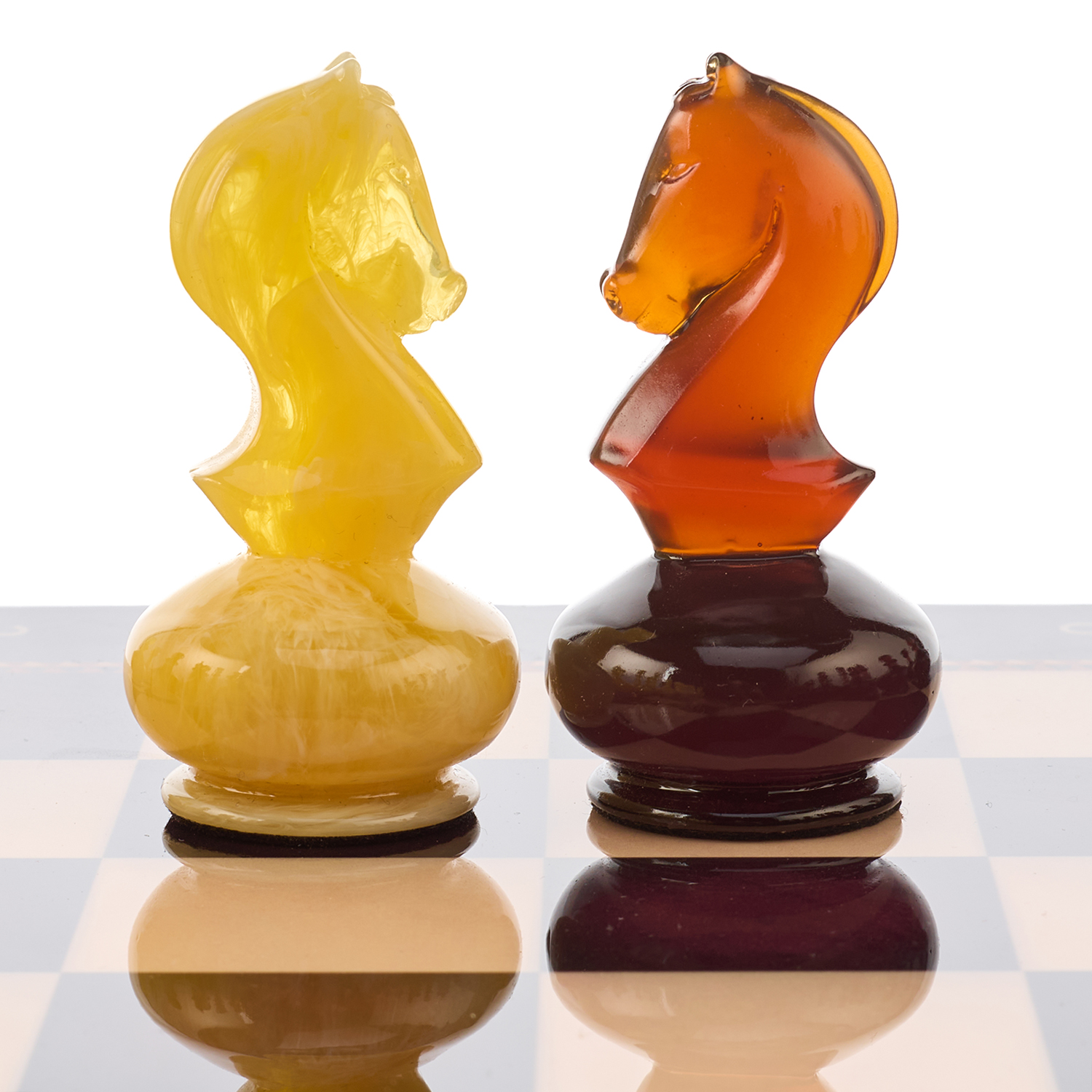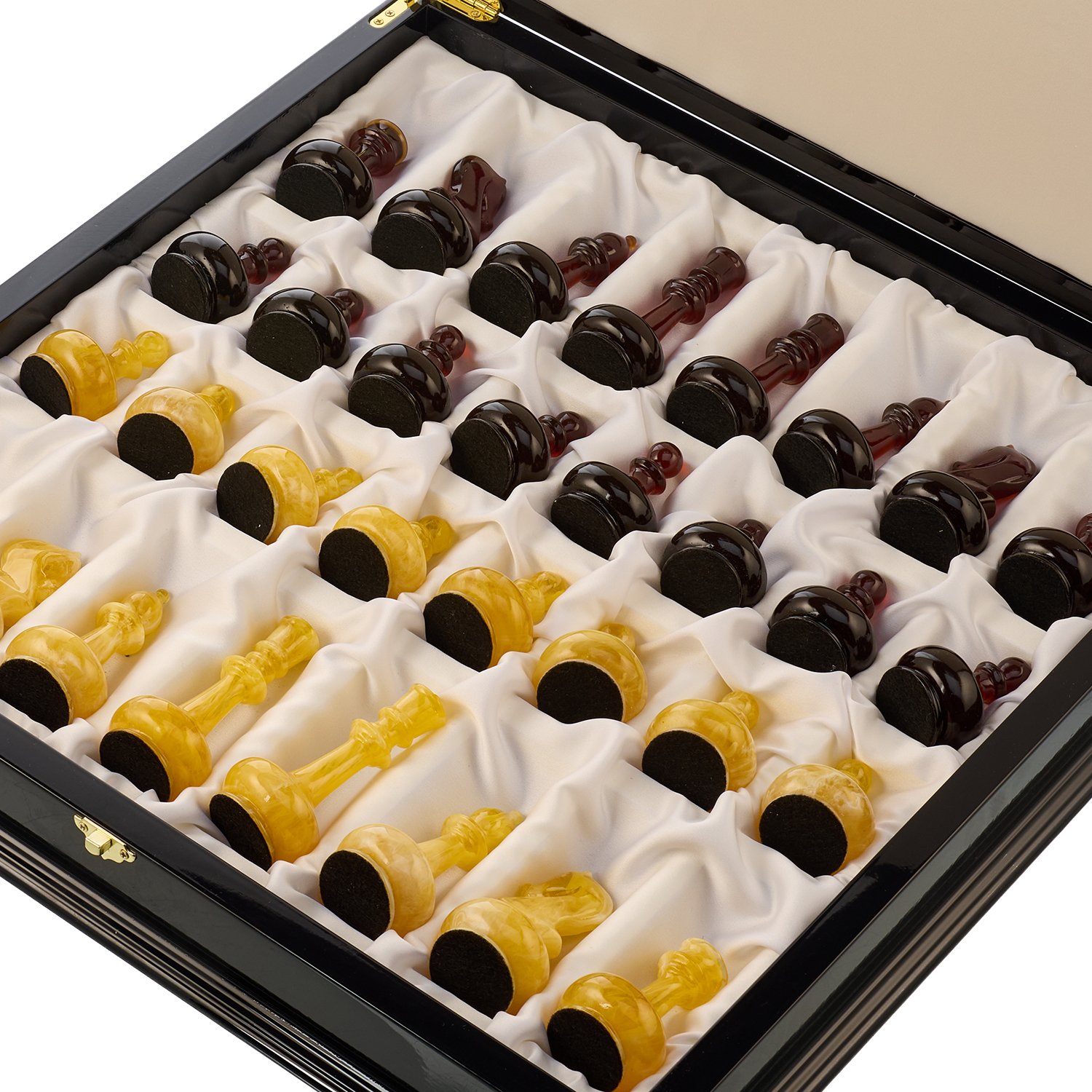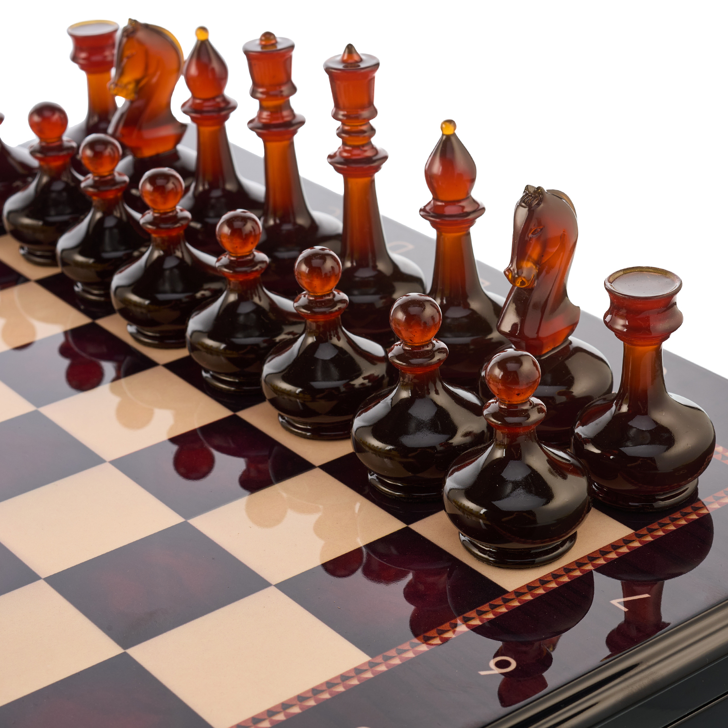 Шахматный ларец с янтарными фигурами.Материалы: дерево, янтарь.