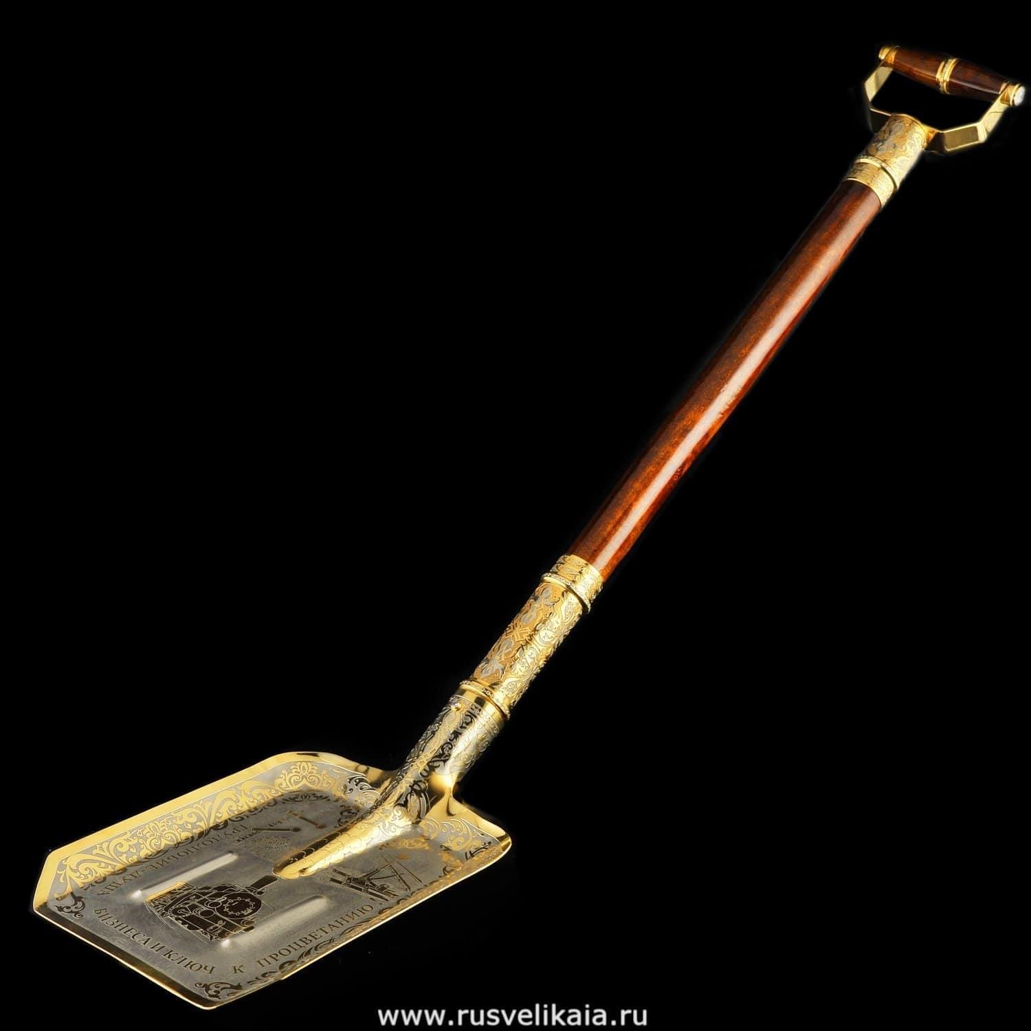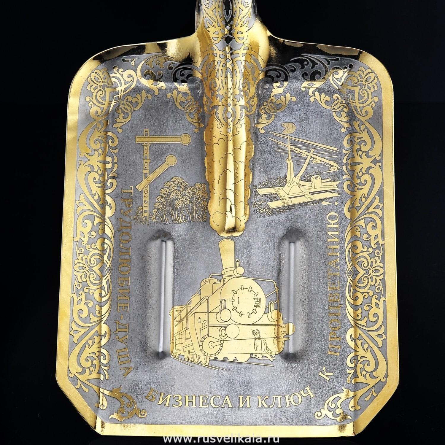 Перед Вами - оригинальный образец предметного дизайна, сувенирная лопата как вариант подарка боссу на день рождения. Рабочая поверхность лопаты тонирована золотом, декорирована гравированной композицией с подписью по периферии: «Трудолюбие - душа бизнеса и ключ к процветанию». Оформление рабочей металлической поверхности лопаты выполнено в техниках Златоустовской гравюры на металле...