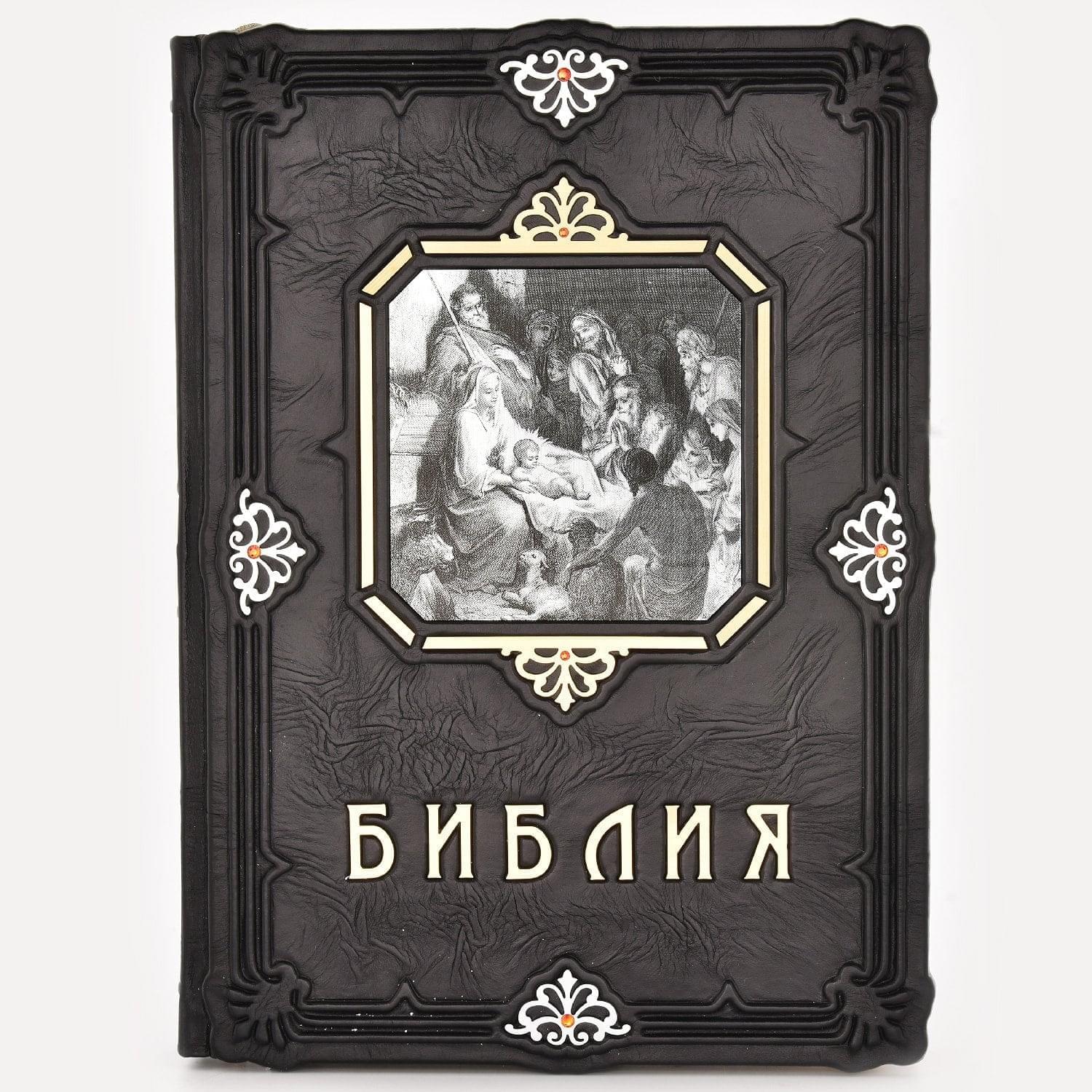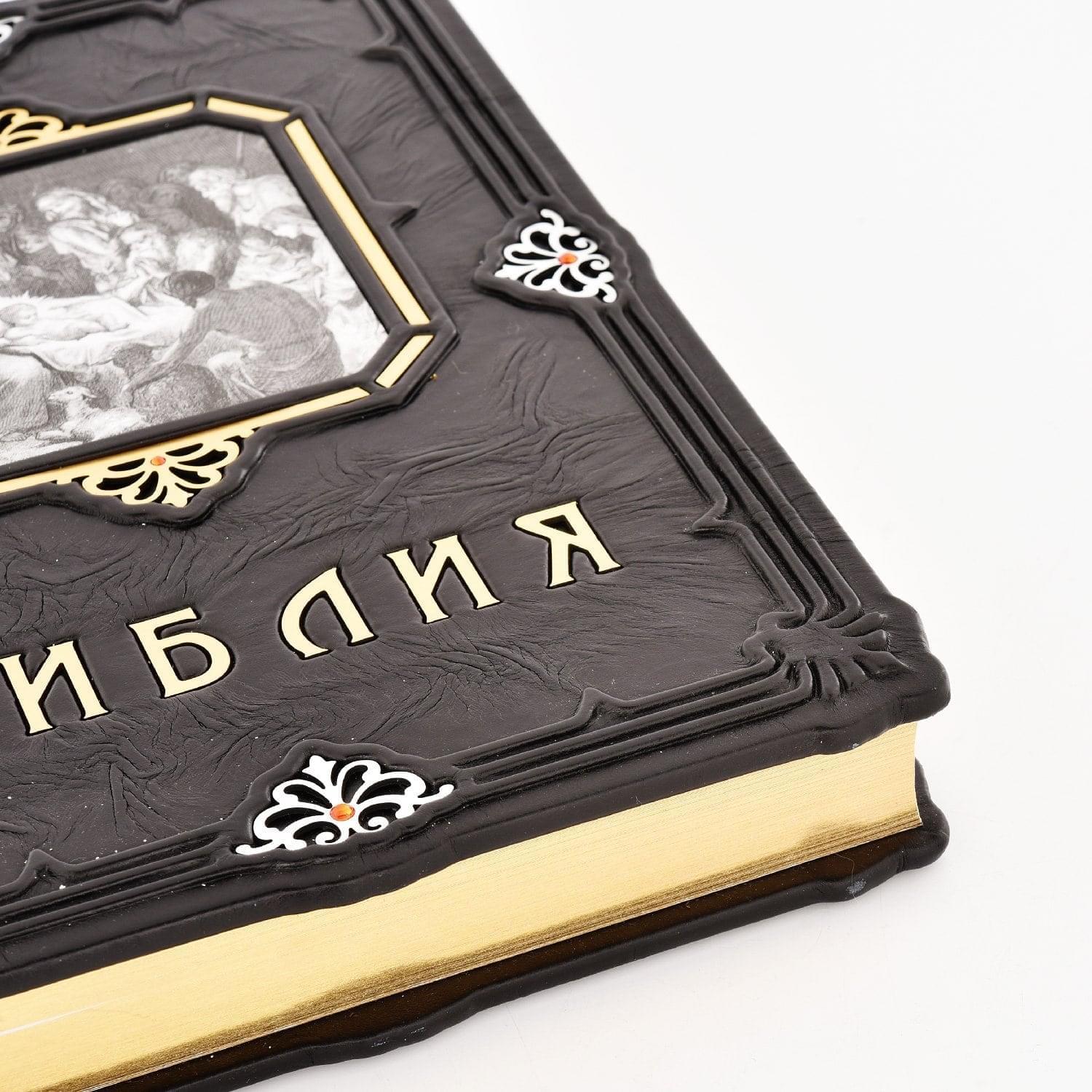 Библия порадует православного христианина, начинающего и продолжающего свой духовный путь. Она проиллюстрирована работами французского художника Гюстава Доре, создавшего множество картин по мотивами библейских сюжетов. Библия переводится с греческого как «книга», «папирус» от места производства - финикийского города Библ. Это собрание текстов, священных в иудаизме и христианстве, Священное Писание. Древнейшие греческие рукописи датируются IV веком н. э.. Книга разделена на главы Стефаном Лэнгтоном (XIII в.) и на стихи Робертом Этьенном (XVI в.). Слово впервые использовано в IV веке Иоанном Златоустом и Епифанием Кипрским. Книги Библии состоят из книг Ветхого и Нового Заветов, в протестантском каноне их 66, в Эфиопской православной церкви - 81. Новый Завет объединяет 27 книг: четыре Евангелия, деяния Апостолов, 21 послание Апостолов и книга Откровение Иоанна Богослова (Апокалипсис) Матфея, Марка, Луки, Иоанна, Петра, Павла, Иакова и Иуды. В 1815 году Александр I повелел «доставить и россиянам способ читать Слово Божие на природном своем российском языке». .