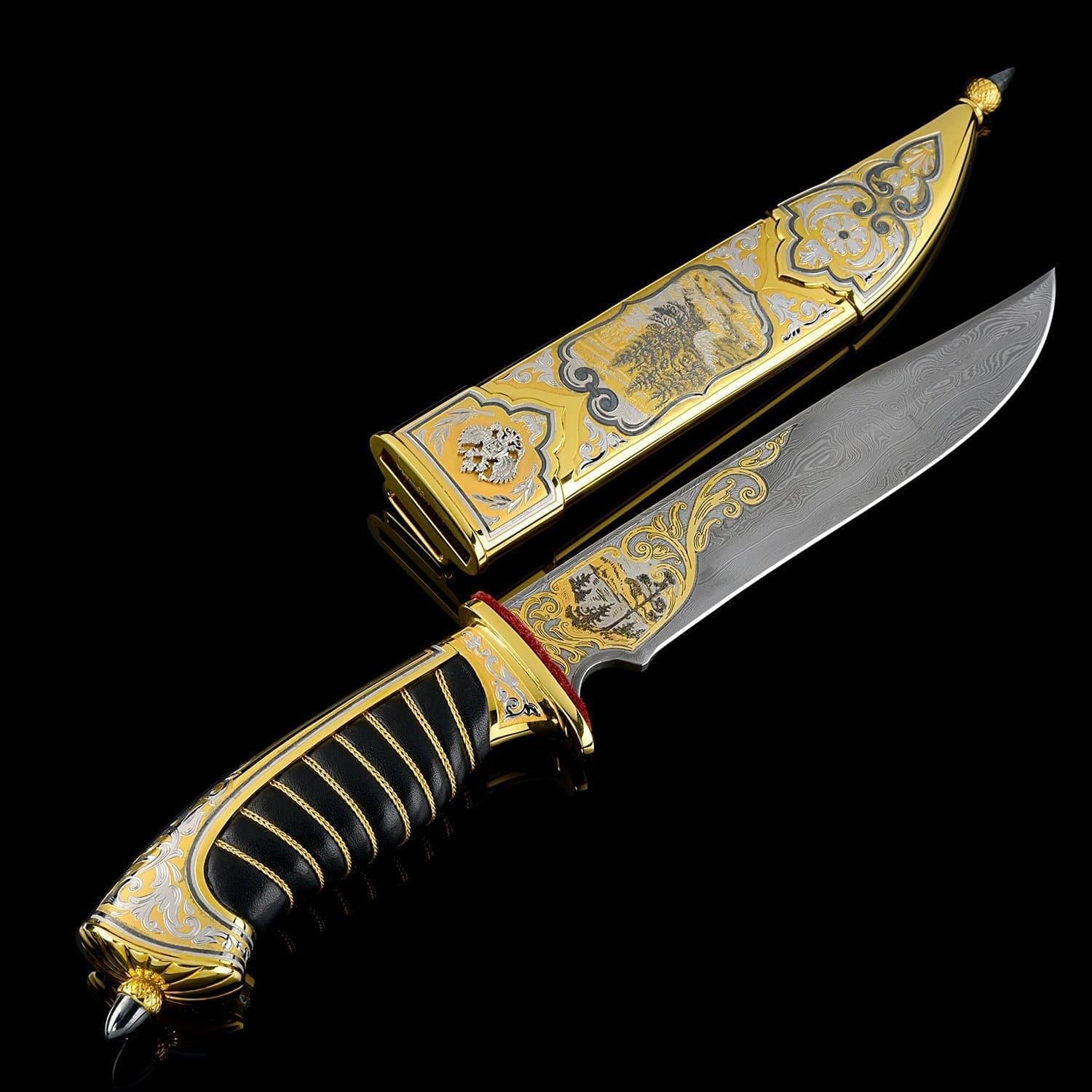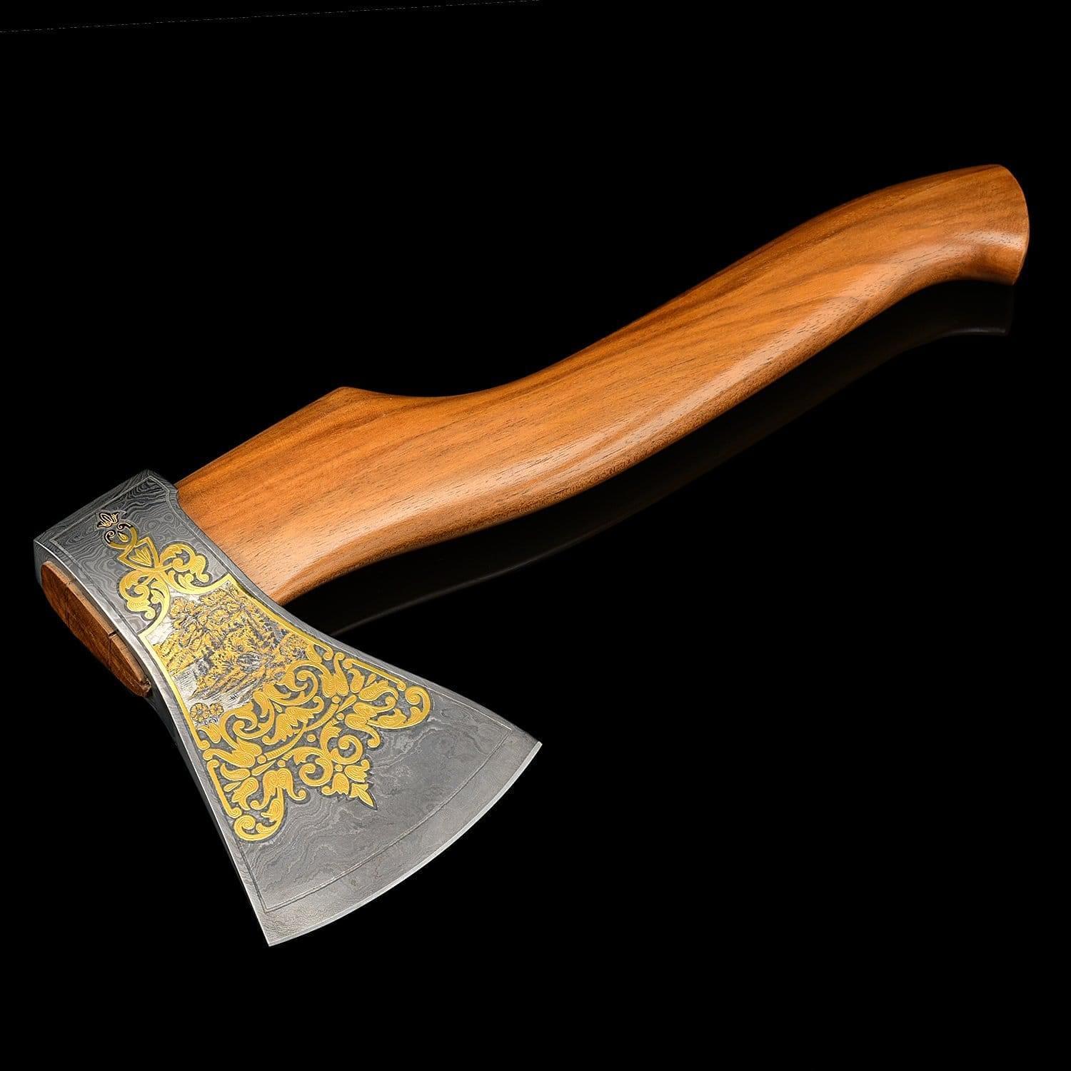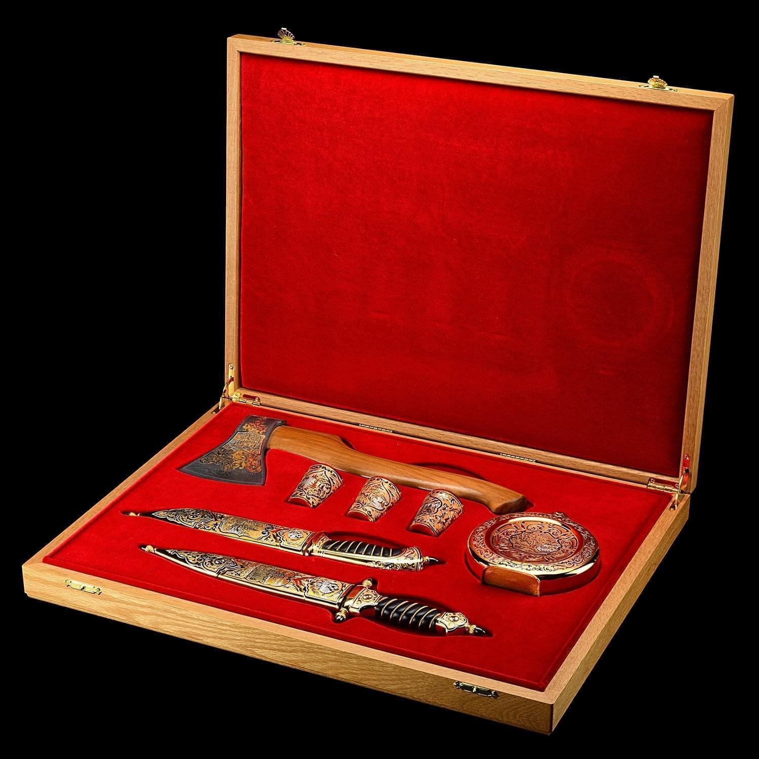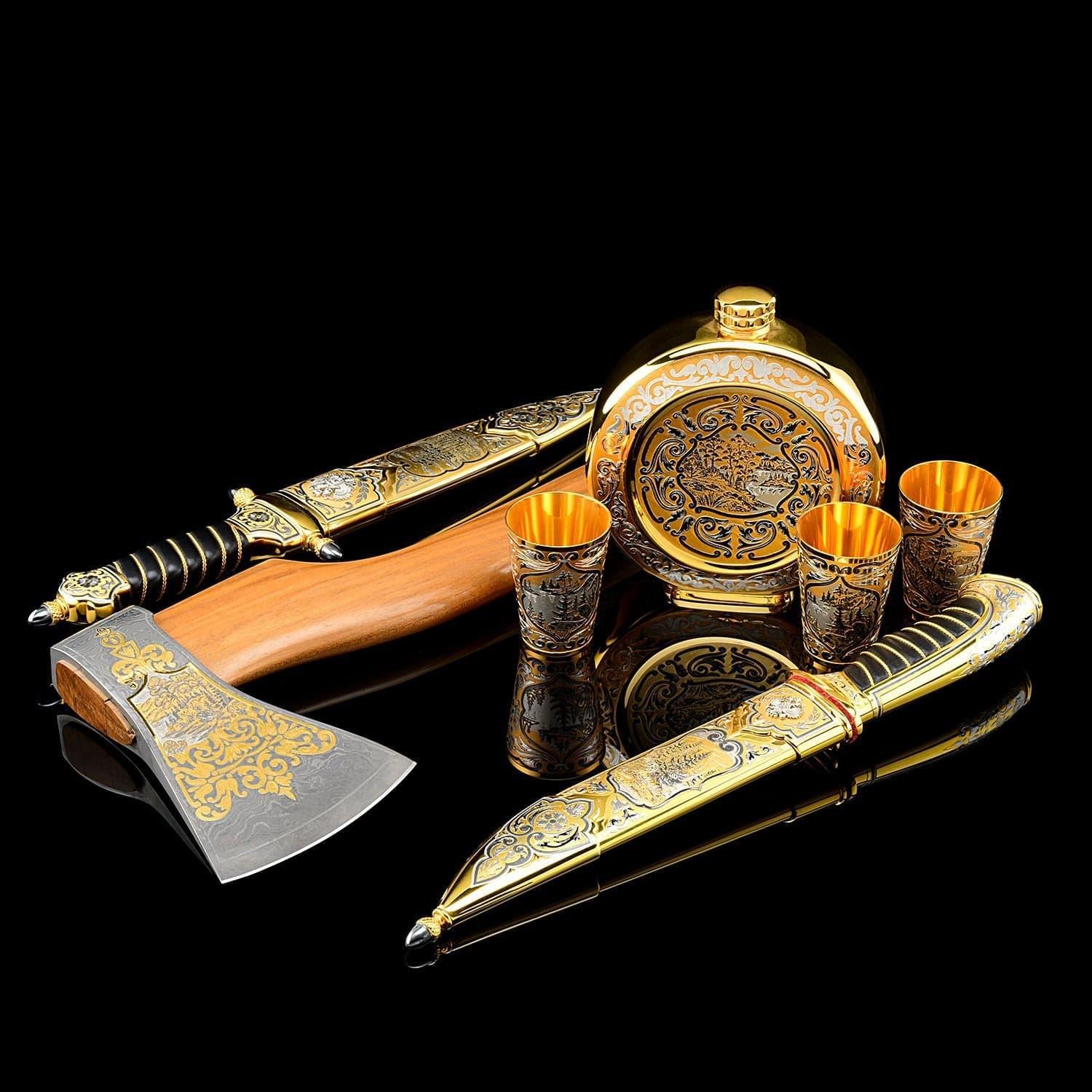 В 1811 году в уральском городке построили центр по выпуску оружия – Златоустовский железоделательный завод. На производство пригласили немецких специалистов, наладили производство дефицитных бытовых изделий: лесопильных пил, лопат, зубил, каминных щипцов, долот, гвоздей, топоров, рессоров, кофейных мельниц. Накануне войны с Наполеоном завод получил заказ на 130 орудий. Официально Златоустовская оружейная фабрика была открыта в 1815 году. Массовый выпуск украшенных клинков начался в 1820 году благодаря опыту немецких мастеров. Умельцы подняли искусство декорирования оружия фирменной гравюрой на особую высоту. Они переходили от орнамента и символического узора к сюжетным, пейзажным сценам, развивали аллегорические изображение. Вскоре новые шрифты и орнаменты сложились в видовые и типовые группы, характерные русскому гравюрному искусству. Мир покорили выразительные силуэты и орнаменты, выполненные в золоте и травленные на различную глубину - за счет чего выглядящие объемно, рельефно, на фоне игре полутонов. В наборе - фляга, три стопки, кинжал, нож охотничий, топор. Материал: сталь дамаск, латунь, нейзильбер, дерево. Размеры: Топор - 39 х 14,5 х 3,2 см. Нож охотничий - 30,5(17) х 3,1 см. Кинжал - 33,5(20) х 3,1 см. Фляжка - 14,5 х 13 х 4 см. Стопки - 4,5 х 6 см. Виды обработки: травление, никелирование, золочение, серебрение, чернение, резьба, литье. ....
