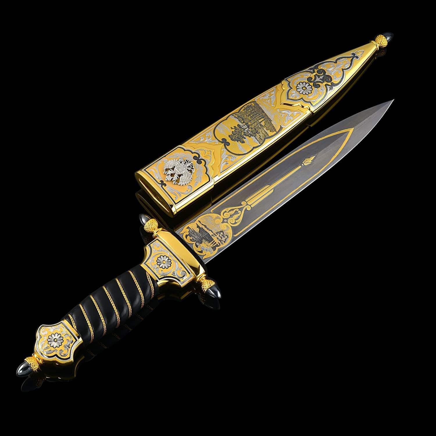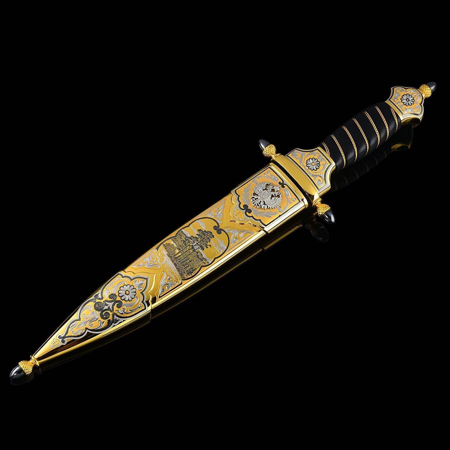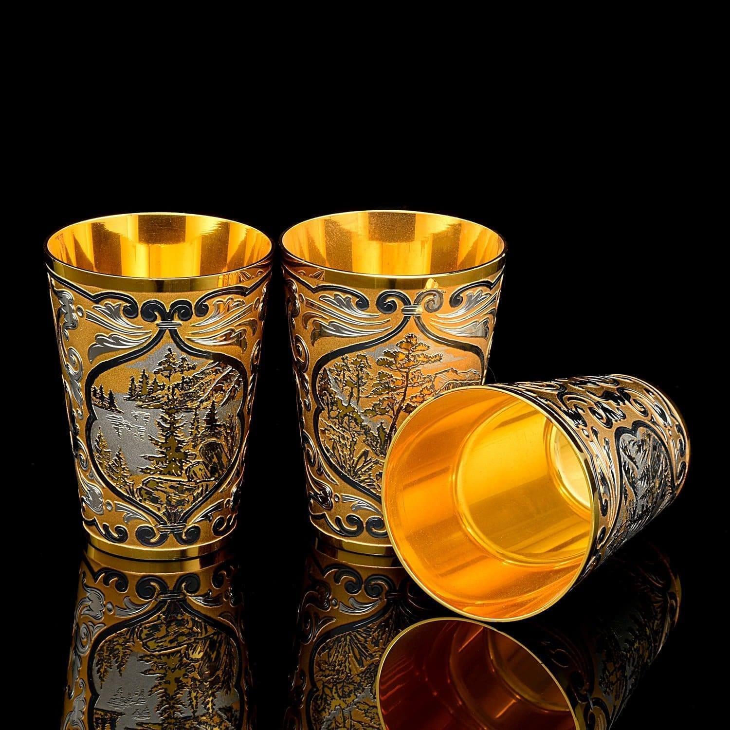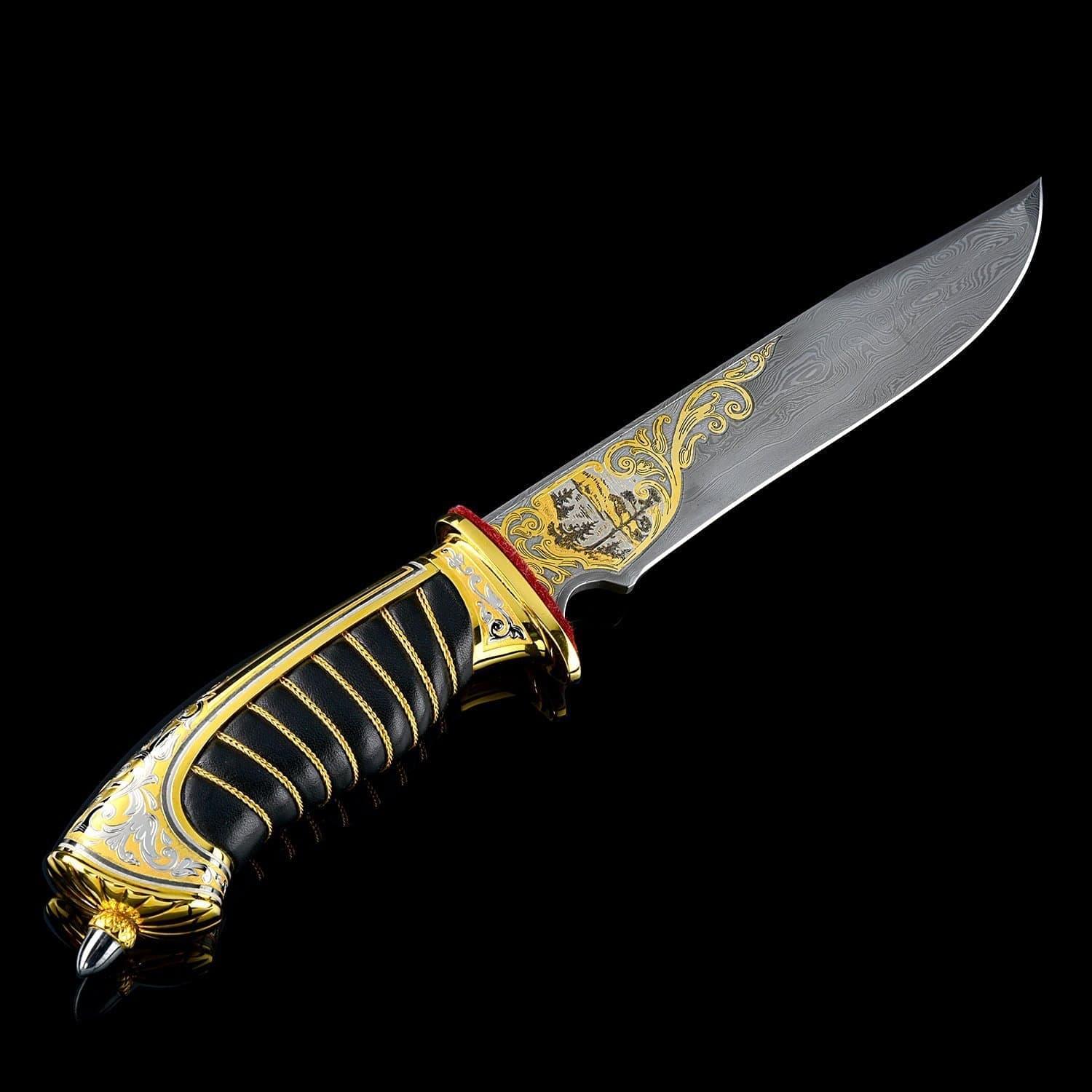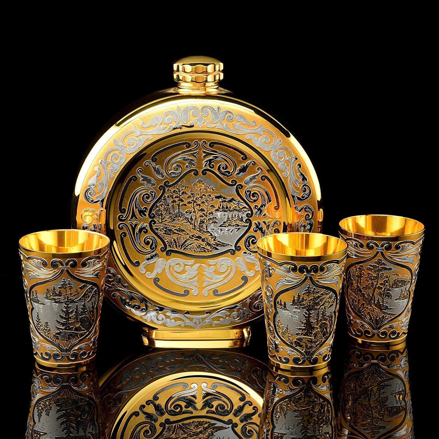 В 1811 году в уральском городке построили центр по выпуску оружия – Златоустовский железоделательный завод. На производство пригласили немецких специалистов, наладили производство дефицитных бытовых изделий: лесопильных пил, лопат, зубил, каминных щипцов, долот, гвоздей, топоров, рессоров, кофейных мельниц. Накануне войны с Наполеоном завод получил заказ на 130 орудий. Официально Златоустовская оружейная фабрика была открыта в 1815 году. Массовый выпуск украшенных клинков начался в 1820 году благодаря опыту немецких мастеров. Умельцы подняли искусство декорирования оружия фирменной гравюрой на особую высоту. Они переходили от орнамента и символического узора к сюжетным, пейзажным сценам, развивали аллегорические изображение. Вскоре новые шрифты и орнаменты сложились в видовые и типовые группы, характерные русскому гравюрному искусству. Мир покорили выразительные силуэты и орнаменты, выполненные в золоте и травленные на различную глубину - за счет чего выглядящие объемно, рельефно, на фоне игре полутонов. В наборе - фляга, три стопки, кинжал, нож охотничий, топор. Материал: сталь дамаск, латунь, нейзильбер, дерево. Размеры: Топор - 39 х 14,5 х 3,2 см. Нож охотничий - 30,5(17) х 3,1 см. Кинжал - 33,5(20) х 3,1 см. Фляжка - 14,5 х 13 х 4 см. Стопки - 4,5 х 6 см. Виды обработки: травление, никелирование, золочение, серебрение, чернение, резьба, литье. ....