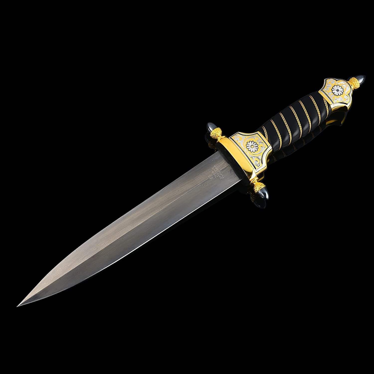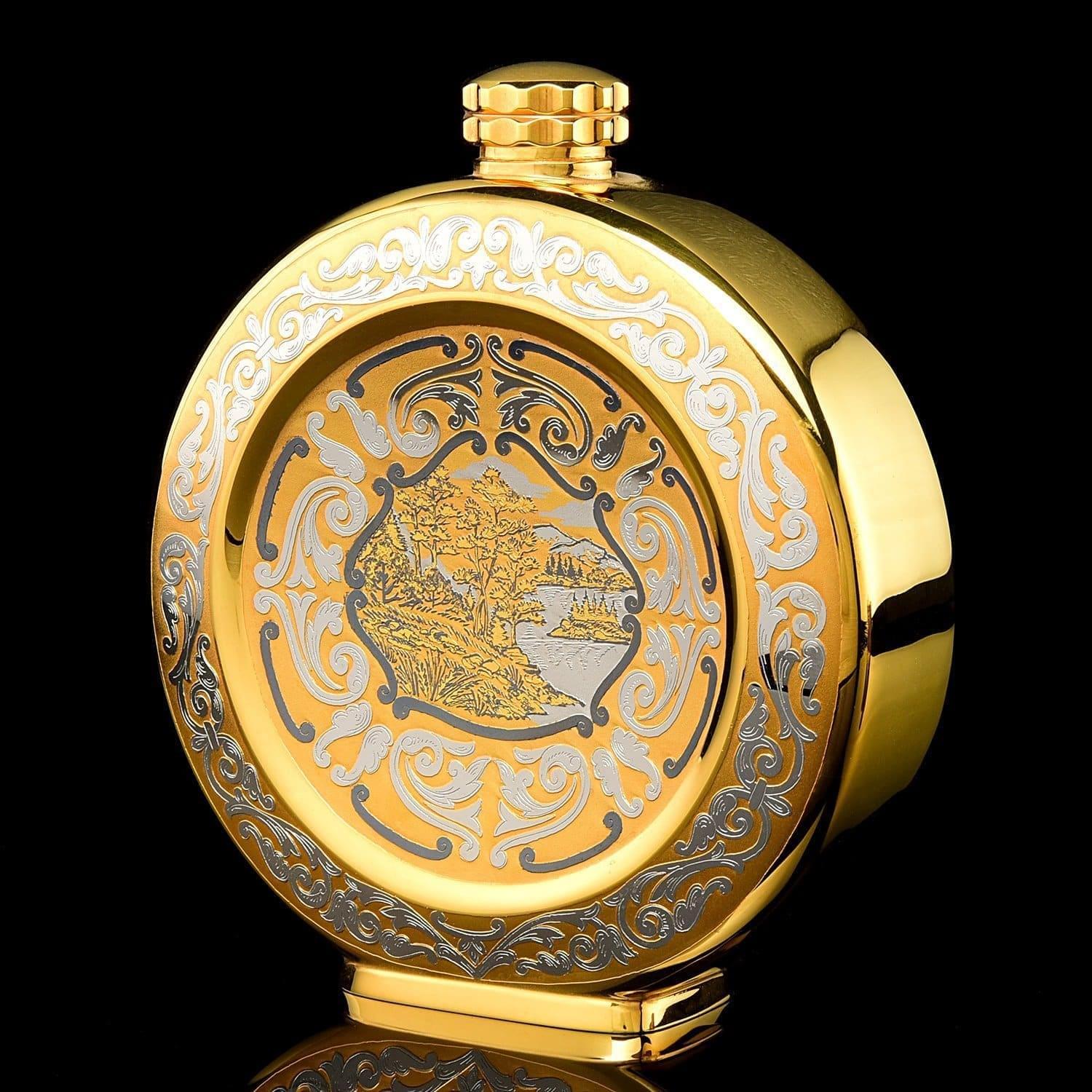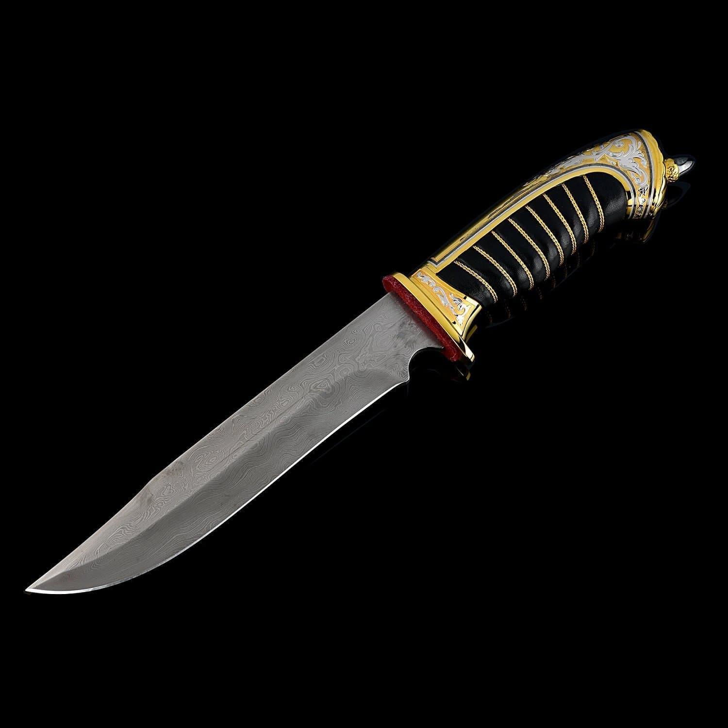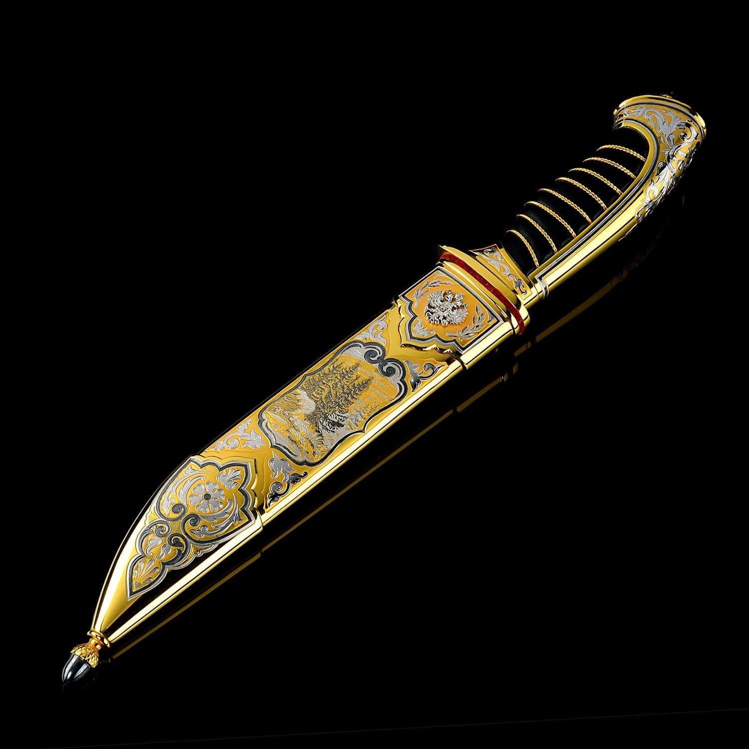В 1811 году в уральском городке построили центр по выпуску оружия – Златоустовский железоделательный завод. На производство пригласили немецких специалистов, наладили производство дефицитных бытовых изделий: лесопильных пил, лопат, зубил, каминных щипцов, долот, гвоздей, топоров, рессоров, кофейных мельниц. Накануне войны с Наполеоном завод получил заказ на 130 орудий. Официально Златоустовская оружейная фабрика была открыта в 1815 году. Массовый выпуск украшенных клинков начался в 1820 году благодаря опыту немецких мастеров. Умельцы подняли искусство декорирования оружия фирменной гравюрой на особую высоту. Они переходили от орнамента и символического узора к сюжетным, пейзажным сценам, развивали аллегорические изображение. Вскоре новые шрифты и орнаменты сложились в видовые и типовые группы, характерные русскому гравюрному искусству. Мир покорили выразительные силуэты и орнаменты, выполненные в золоте и травленные на различную глубину - за счет чего выглядящие объемно, рельефно, на фоне игре полутонов. В наборе - фляга, три стопки, кинжал, нож охотничий, топор. Материал: сталь дамаск, латунь, нейзильбер, дерево. Размеры: Топор - 39 х 14,5 х 3,2 см. Нож охотничий - 30,5(17) х 3,1 см. Кинжал - 33,5(20) х 3,1 см. Фляжка - 14,5 х 13 х 4 см. Стопки - 4,5 х 6 см. Виды обработки: травление, никелирование, золочение, серебрение, чернение, резьба, литье. ....