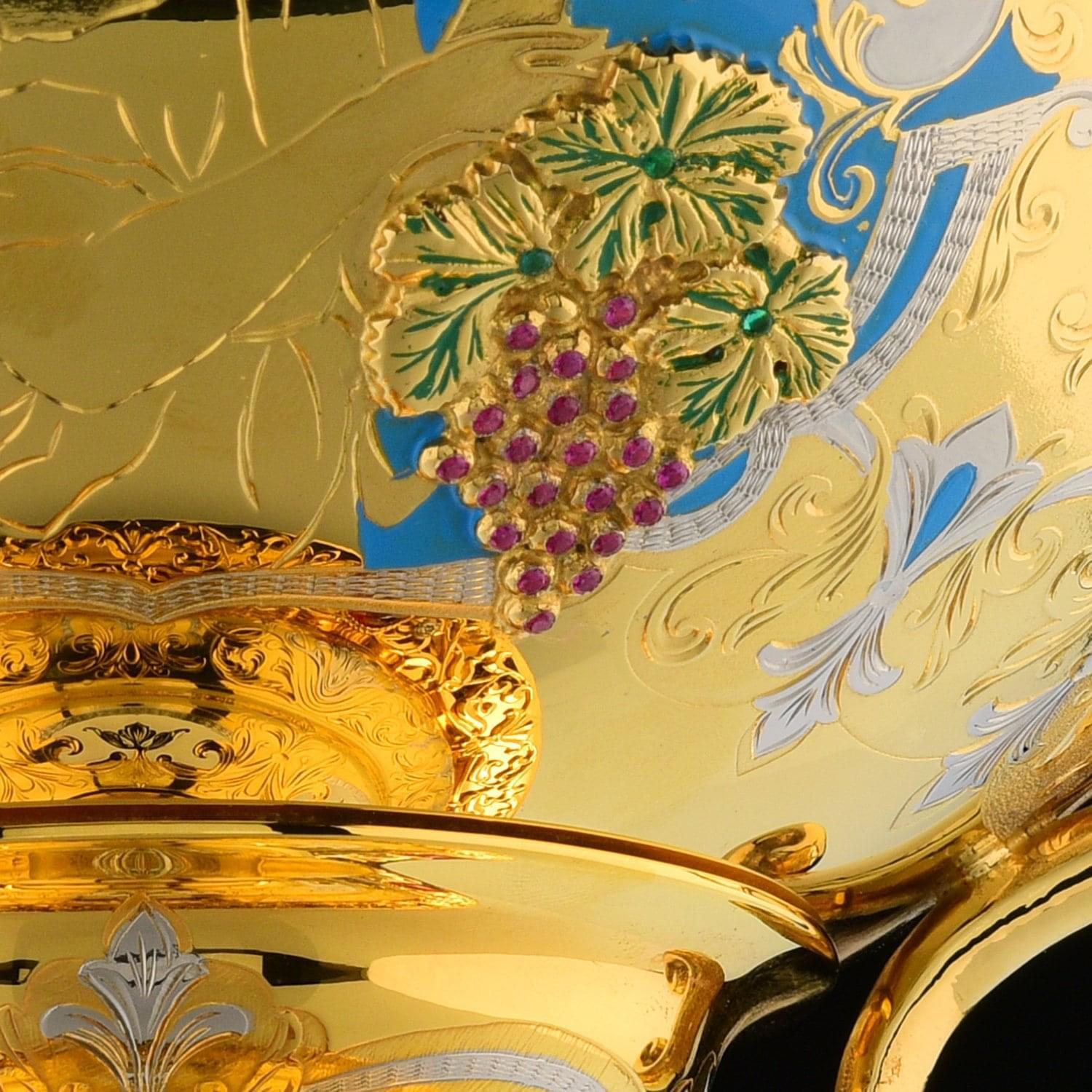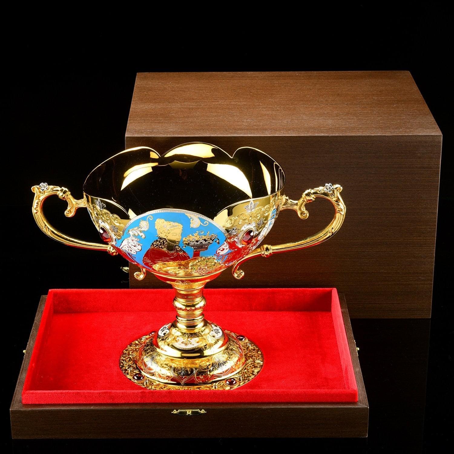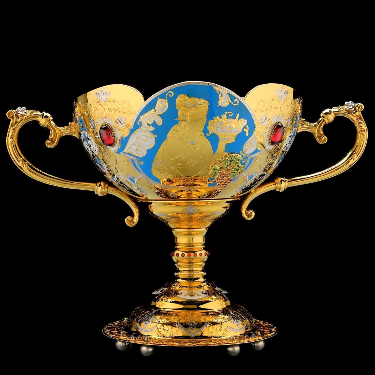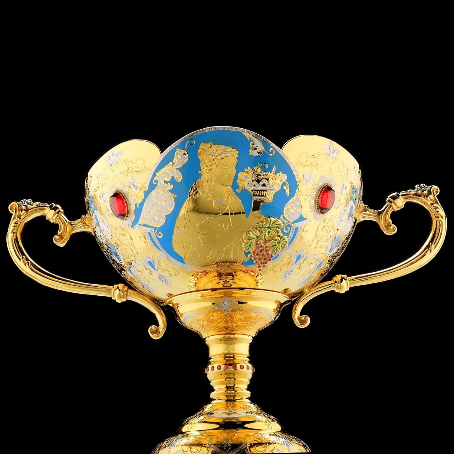 Чаша в виде цветочного бутона с лепестками - символ жизни и изобилия. Корпус чаши декорирован в техниках гравюры на металле оригинальной композицией с лирическим  женским образом; расставлены акценты посредством голубой и белой эмали; металлические поверхности инкрустированы полудрагоценными камнями, сияющими фианитами.