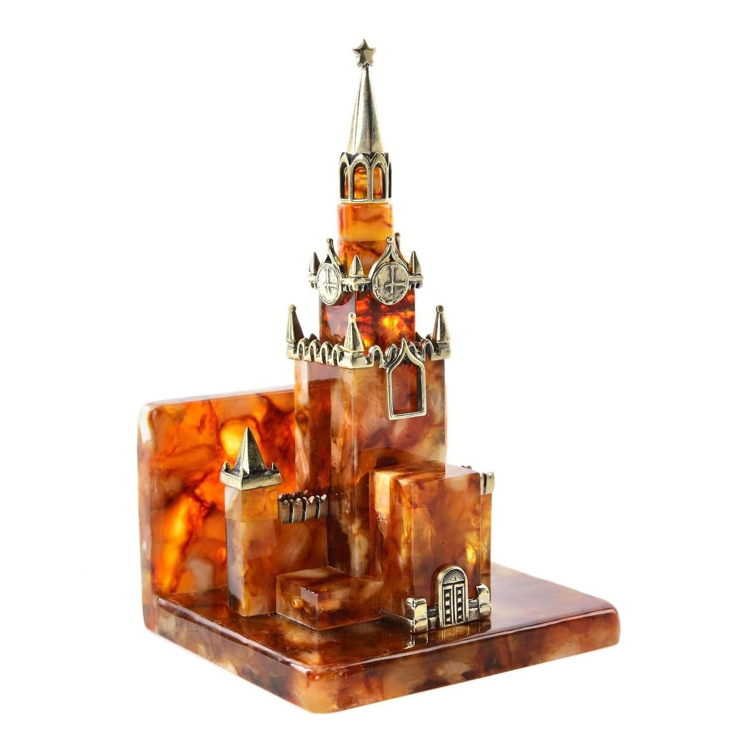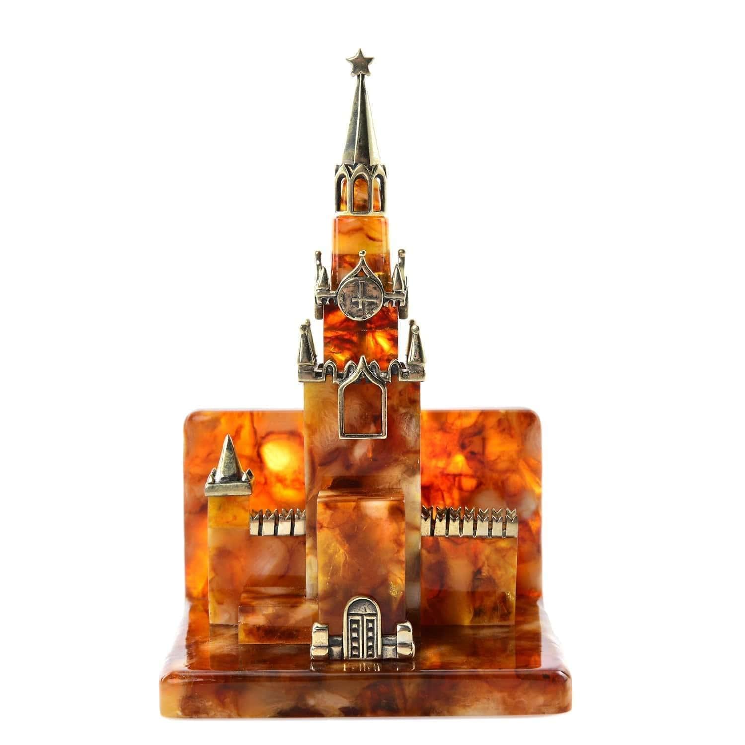 Еще один символичный интерьерный аксессуар, отличный подарок для партнера по бизнесу, коллеги-чиновника и государственного деятеля! Дизайнерская визитница изготовлена из прессованного янтаря - солнечного природного минерала, камней, найденных на берегах Балтики. Элементы дизайна этого аксессуара - Спасская башня Московского Кремля с Кремлевской стеной в миниатюре...