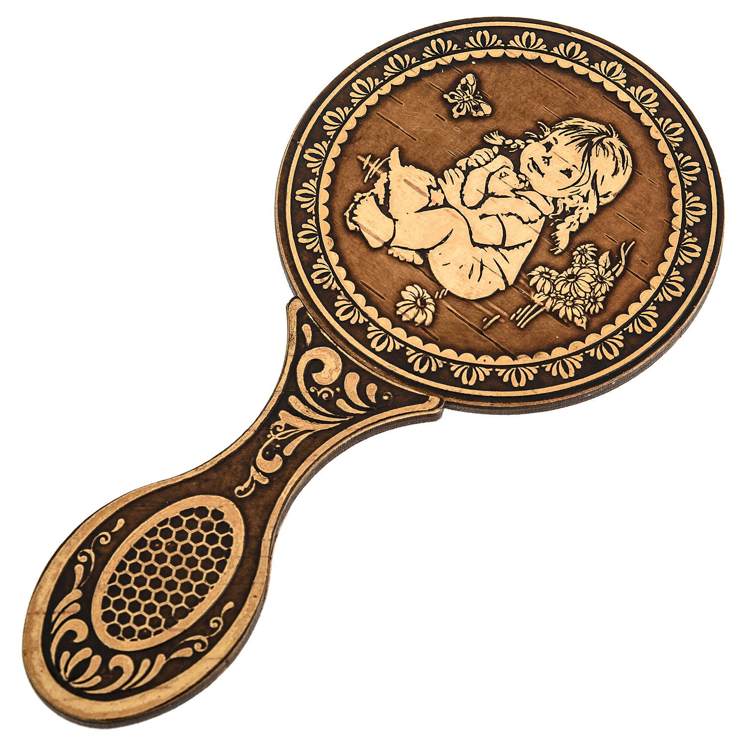 Русские подарки и сувениры → Аксессуары → Зеркала карманные → Зеркало с ручкой в оправе из бересты "Дружба"