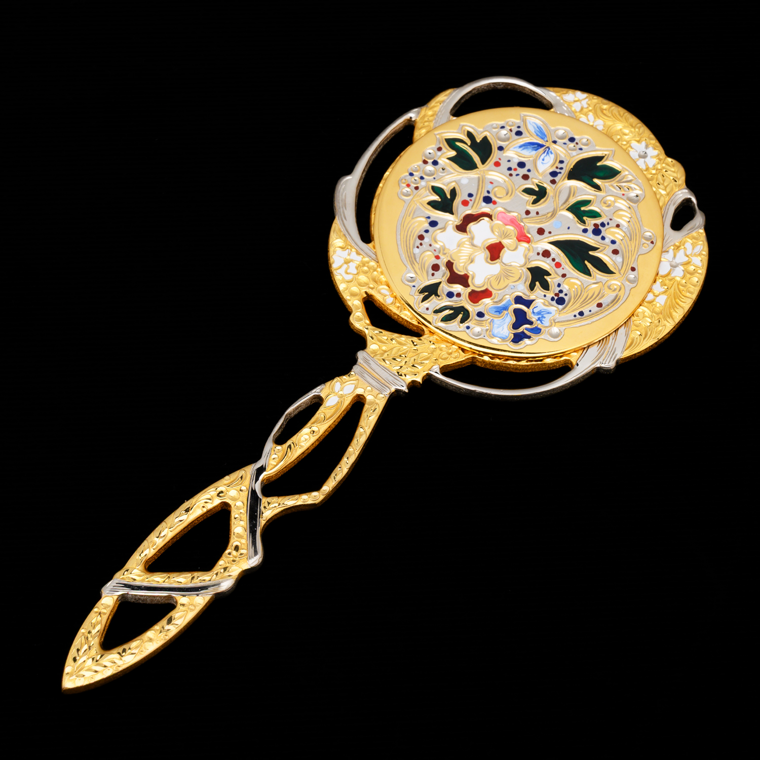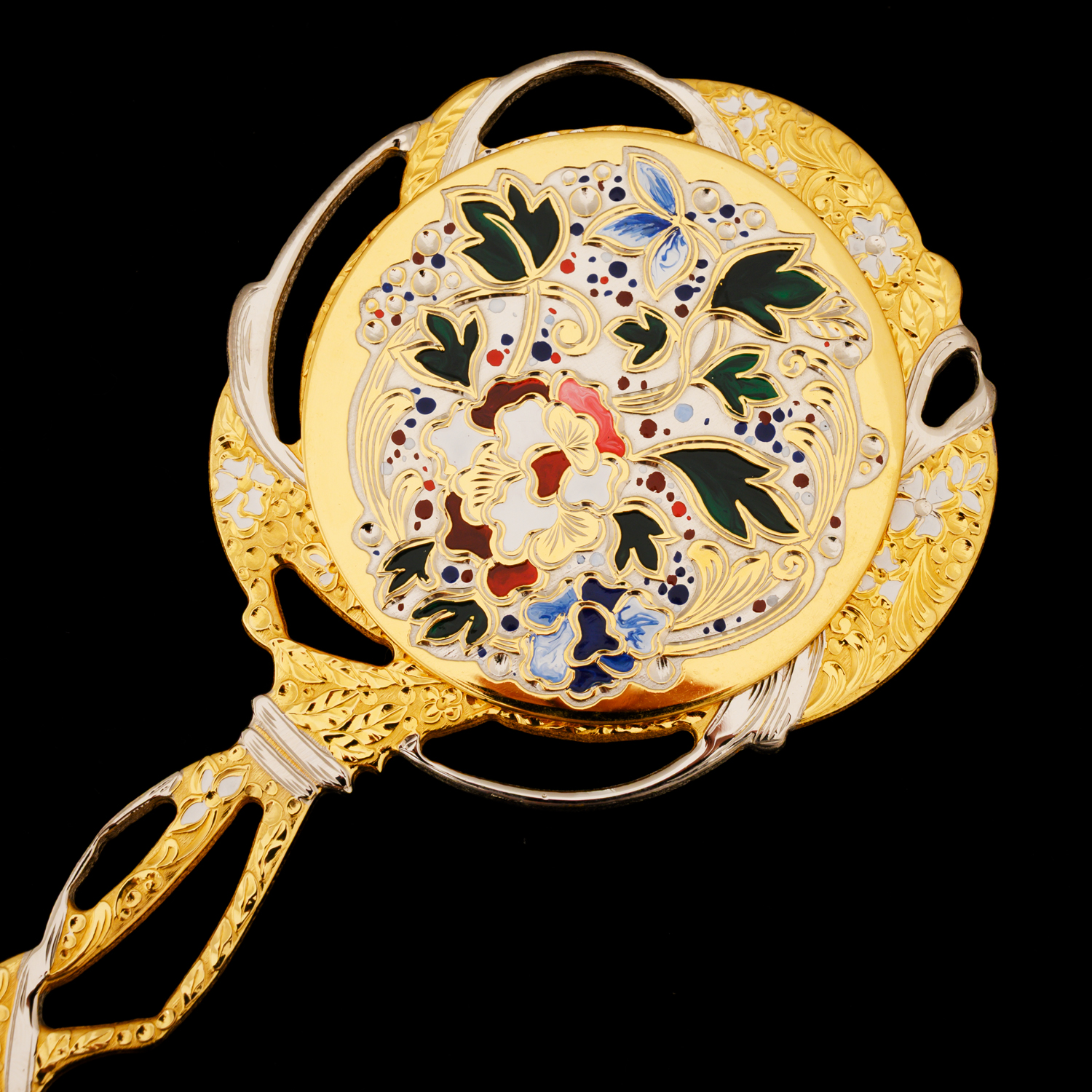 Зеркало с позолотой и эмалью. Златоуст.Материалы: латунь, никель, золото 999,9*, эмаль, стекло.