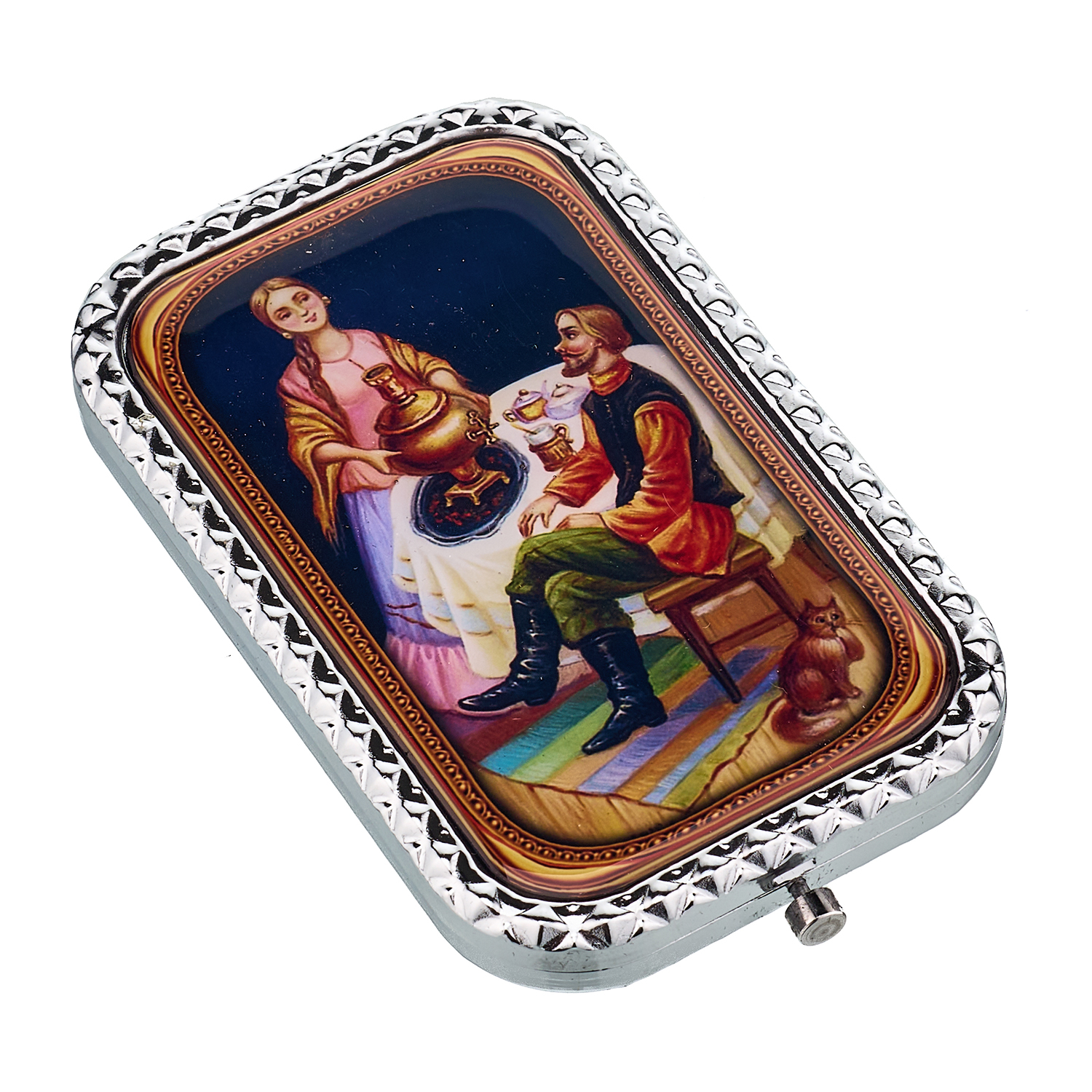 Сувенирное карманное зеркало с сюжетом.Материалы: металл, стекло.
